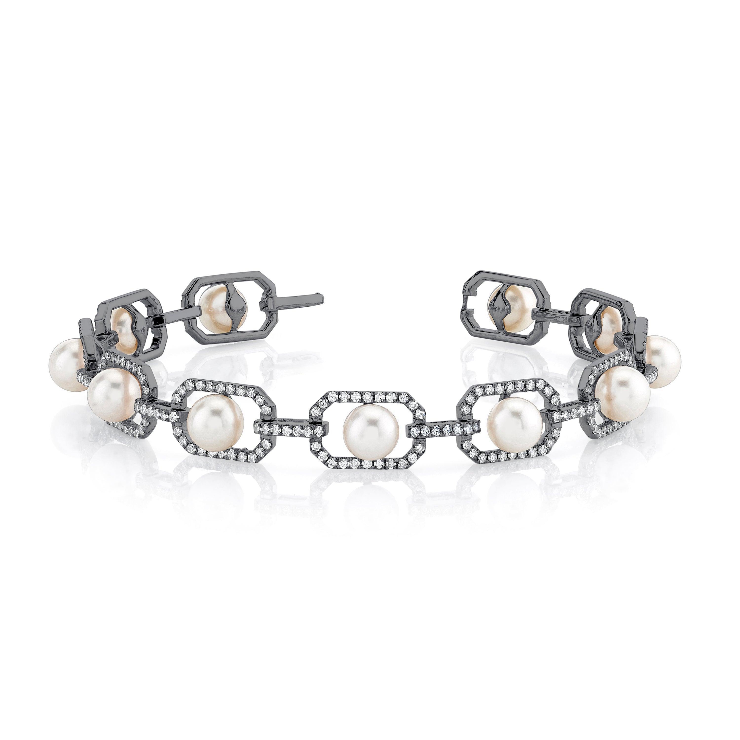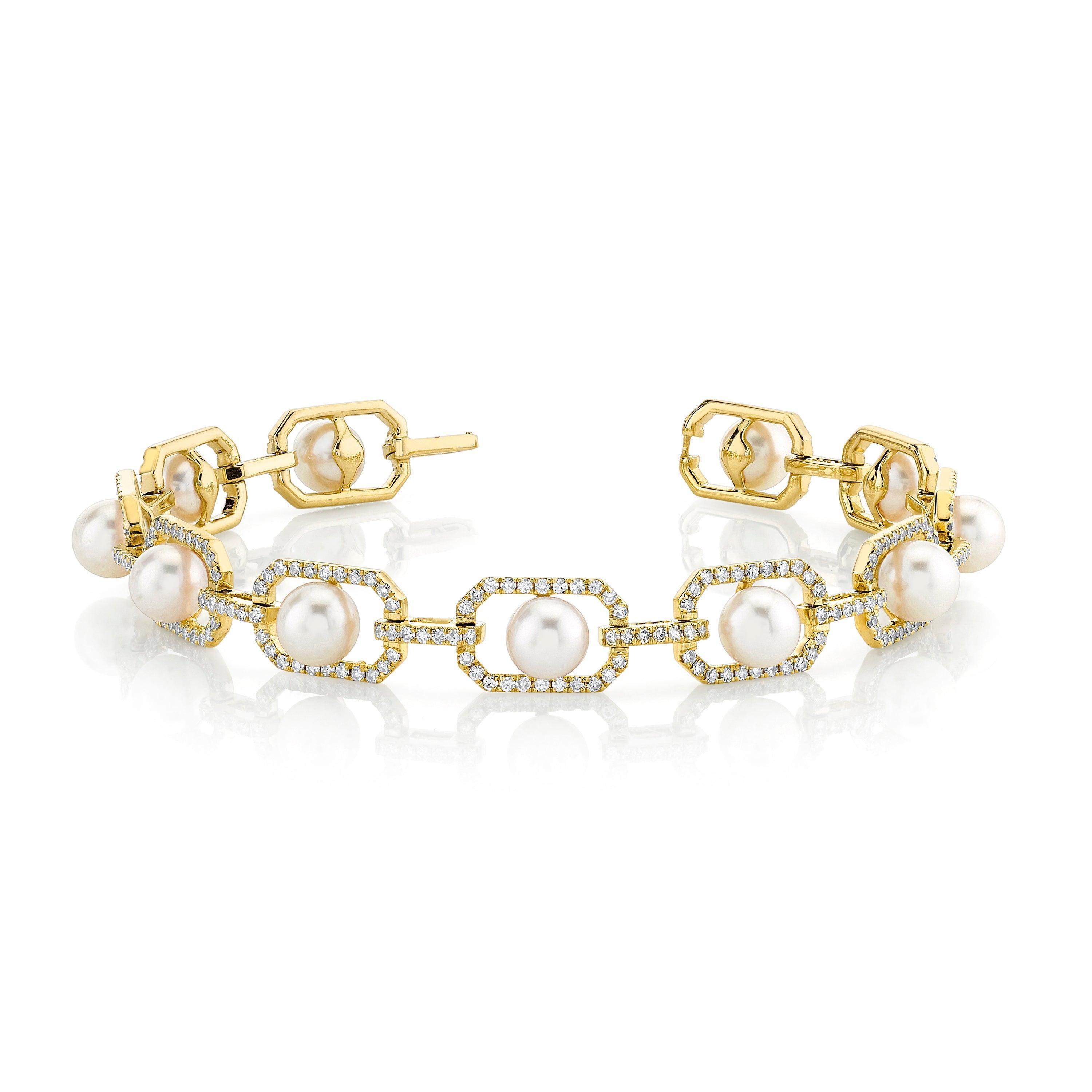The SHAY Caged Pearl & Diamond Bracelet is a modern take on pearls. This 18k gold bracelet is embellished with pave diamonds. Within the links the all natural pearls are set to have the illusion of floating inside the unique cage link. This bracelet closure is a hinge clasp.