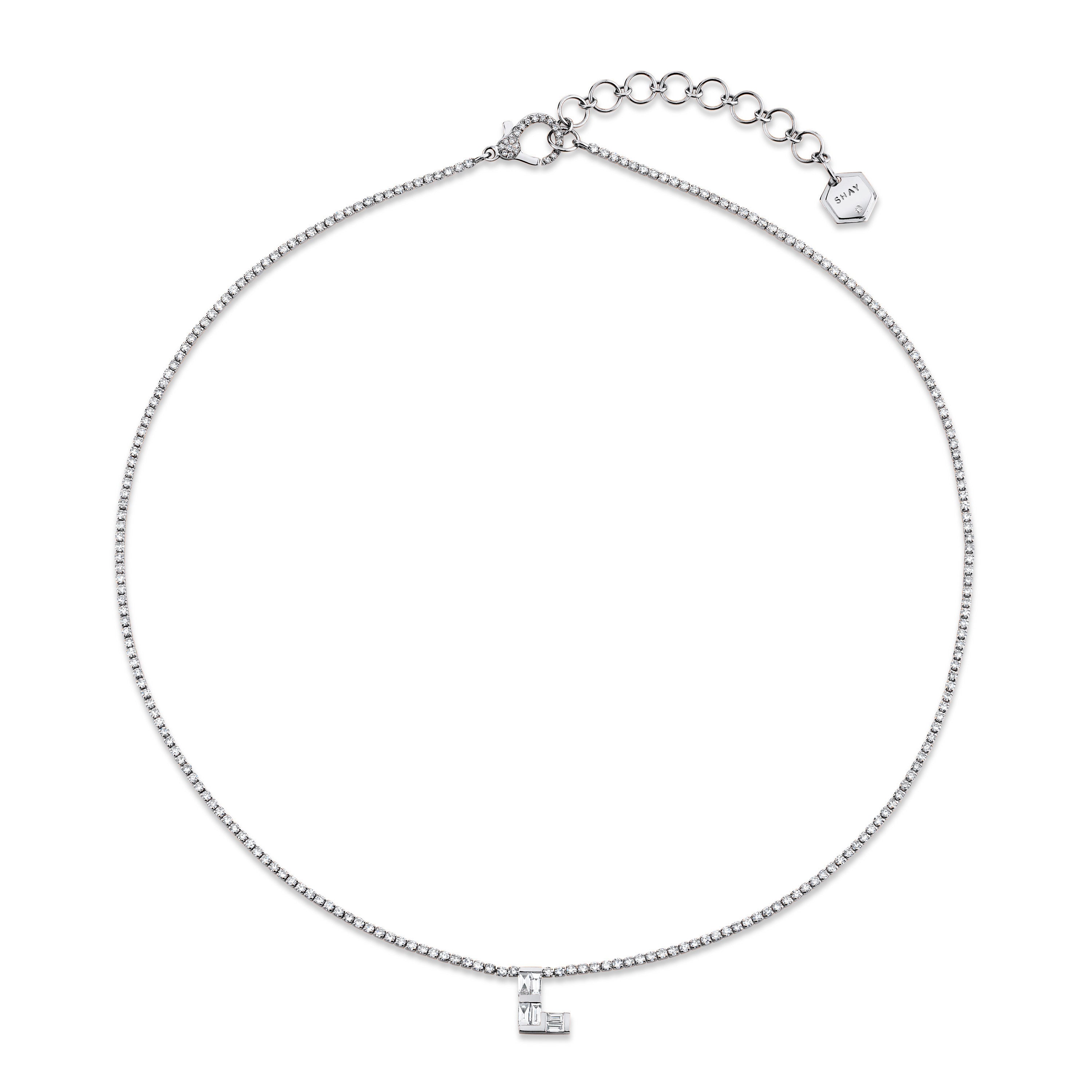 The SHAY Diamond Baguette Personalized Initial Pave Threads Necklace features our signature diamond pave threads necklace with a 9mm white diamond baguette initial in the center of the necklace.