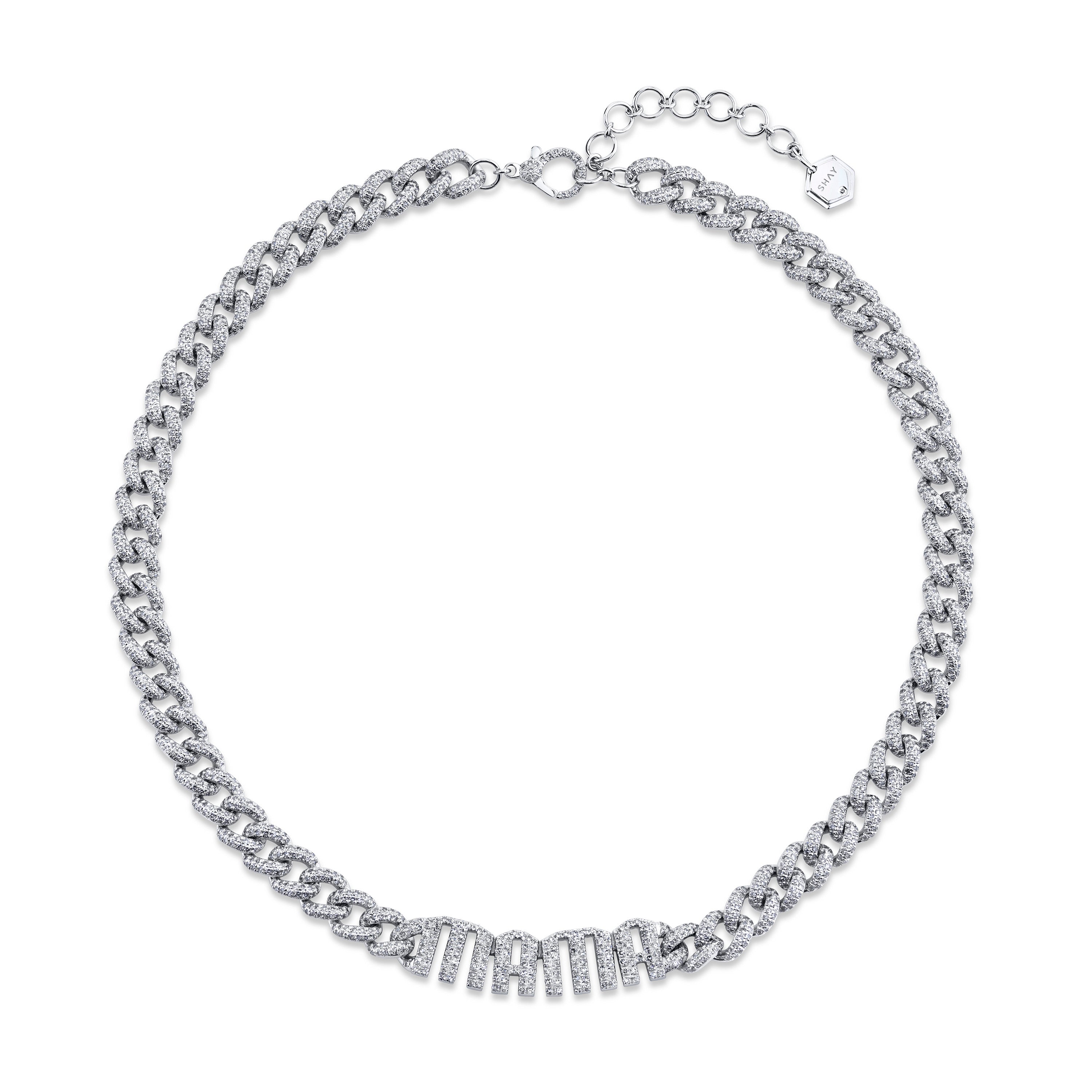 The SHAY Diamond Pave Personalized 4 Letter Medium Link Necklace features our 18k gold medium cuban chain link with white diamond pave and a 4 letter customization in the center that is covered in 7.70cts of white diamond pave.