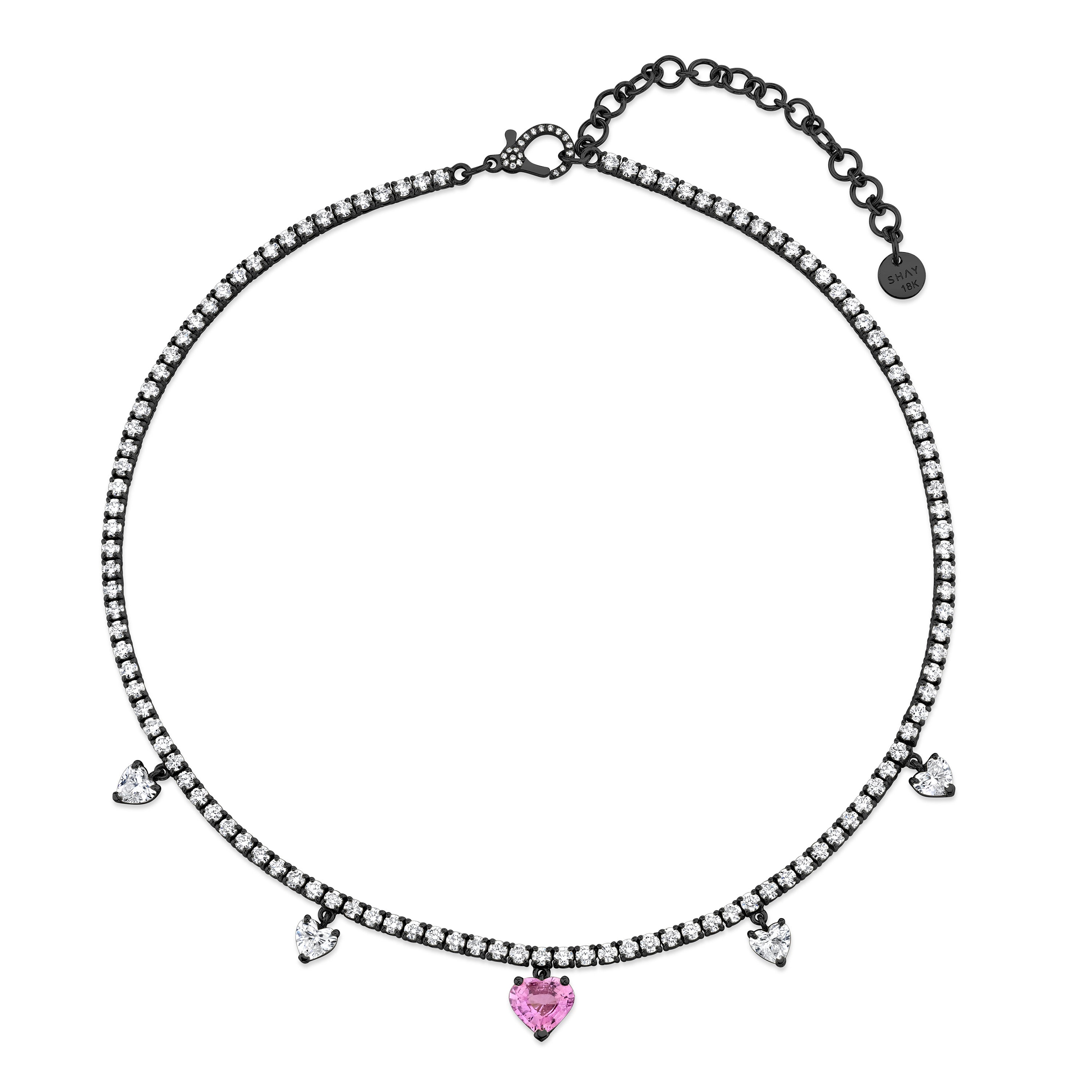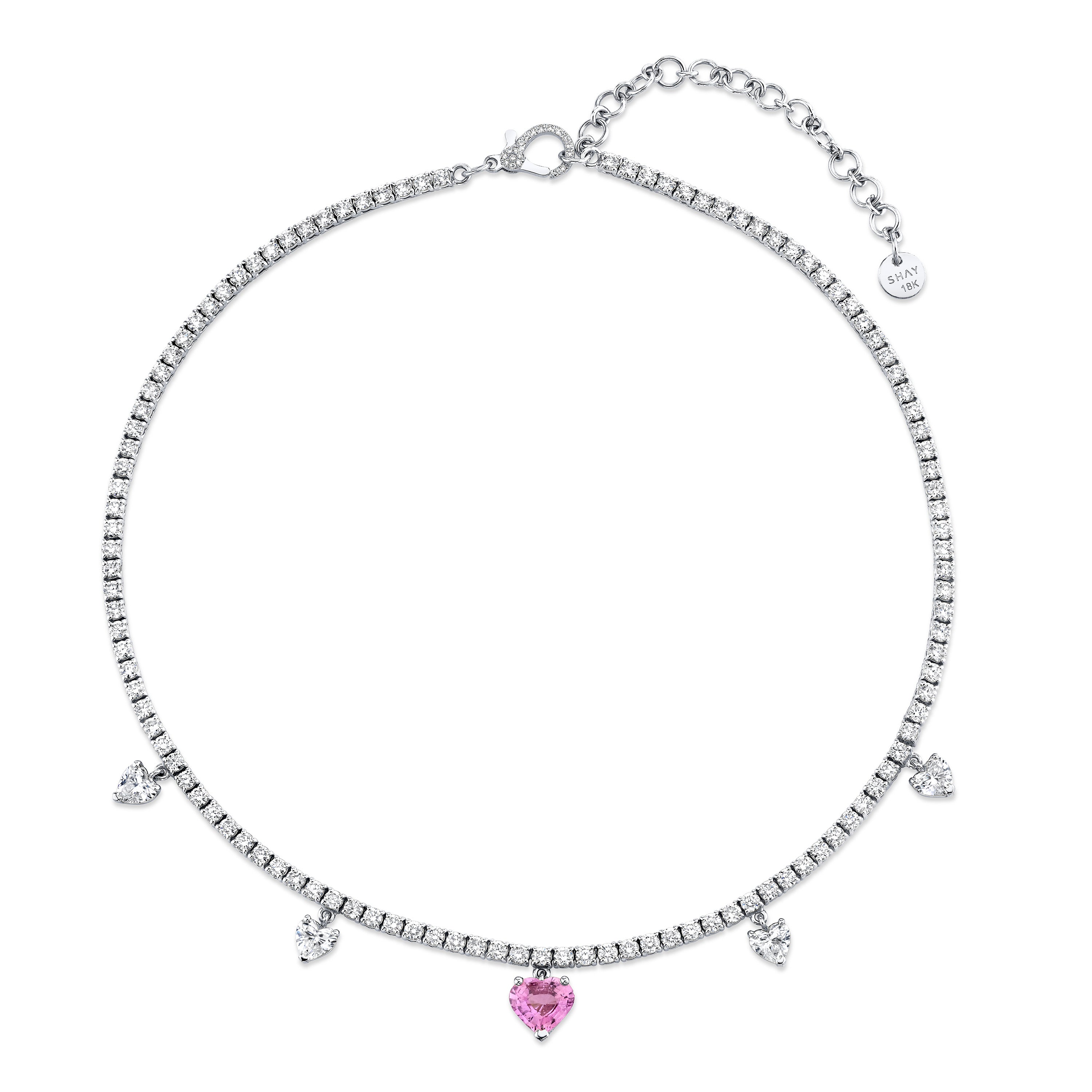 The SHAY Diamond & Pink Sapphire 4 Heart Drop Tennis Necklace.