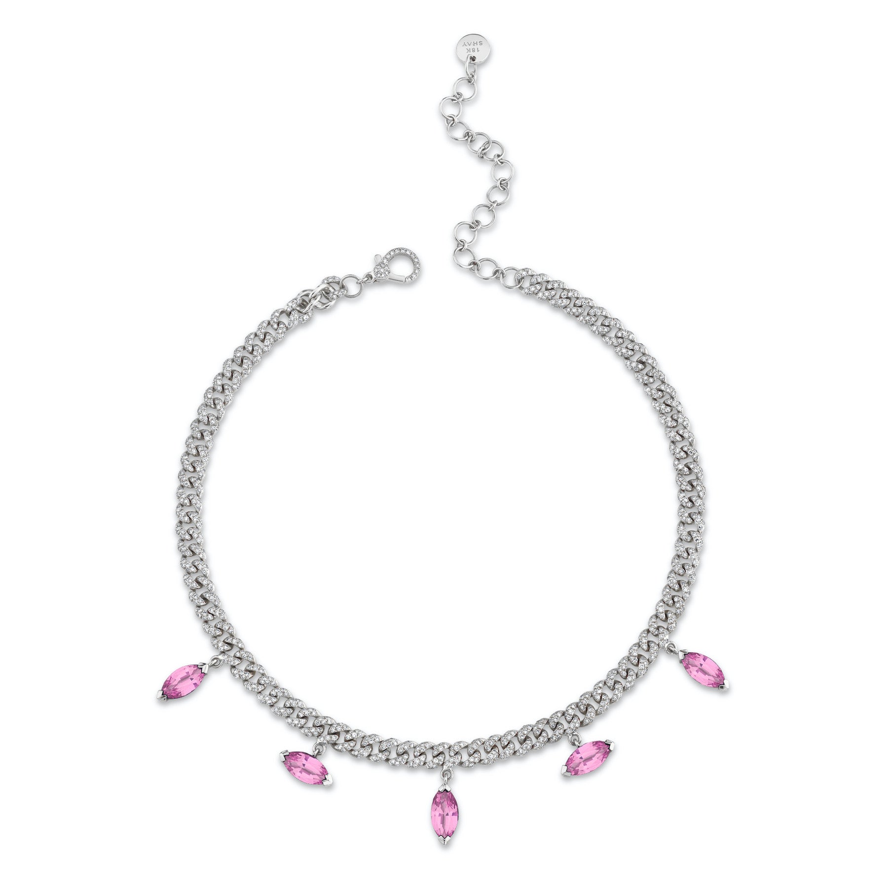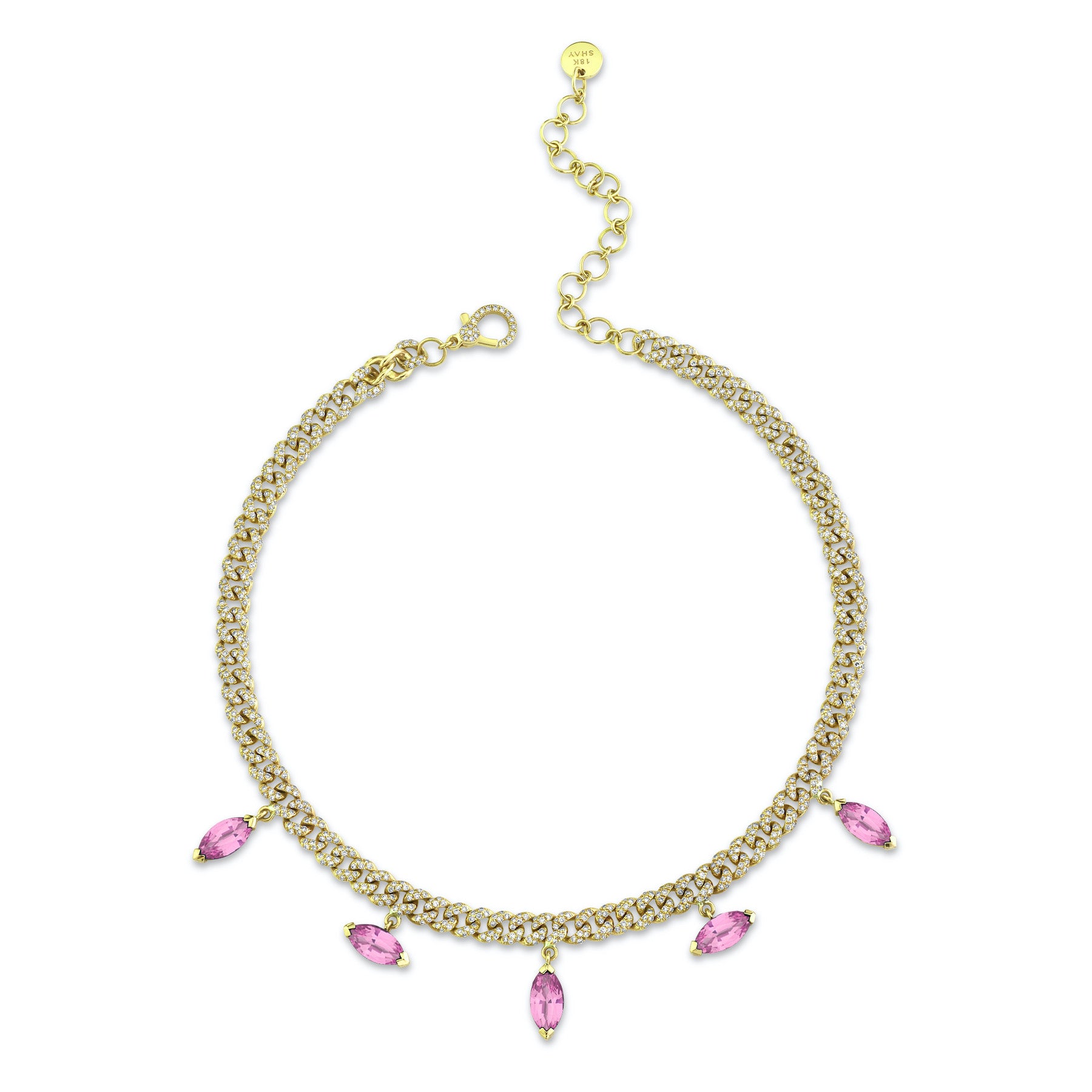 The SHAY Pink Sapphire Marquise Drop Mini Link Necklace features 5 exquisite pink sapphire drops hanging from a diamond pave mini choker. Its adjustable length means it can be worn as a choker or necklace and is perfect for stacking or as a statement piece on its own.