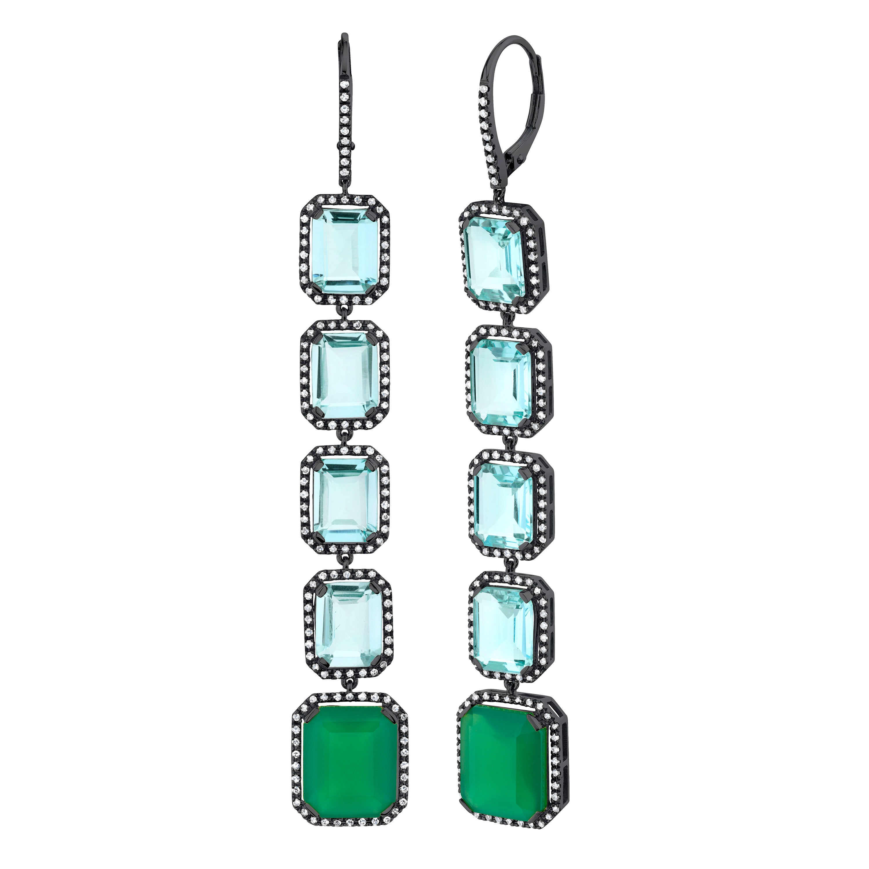 The SHAY Blue Topaz & Green Agate 5 Tier Portrait Earrings.