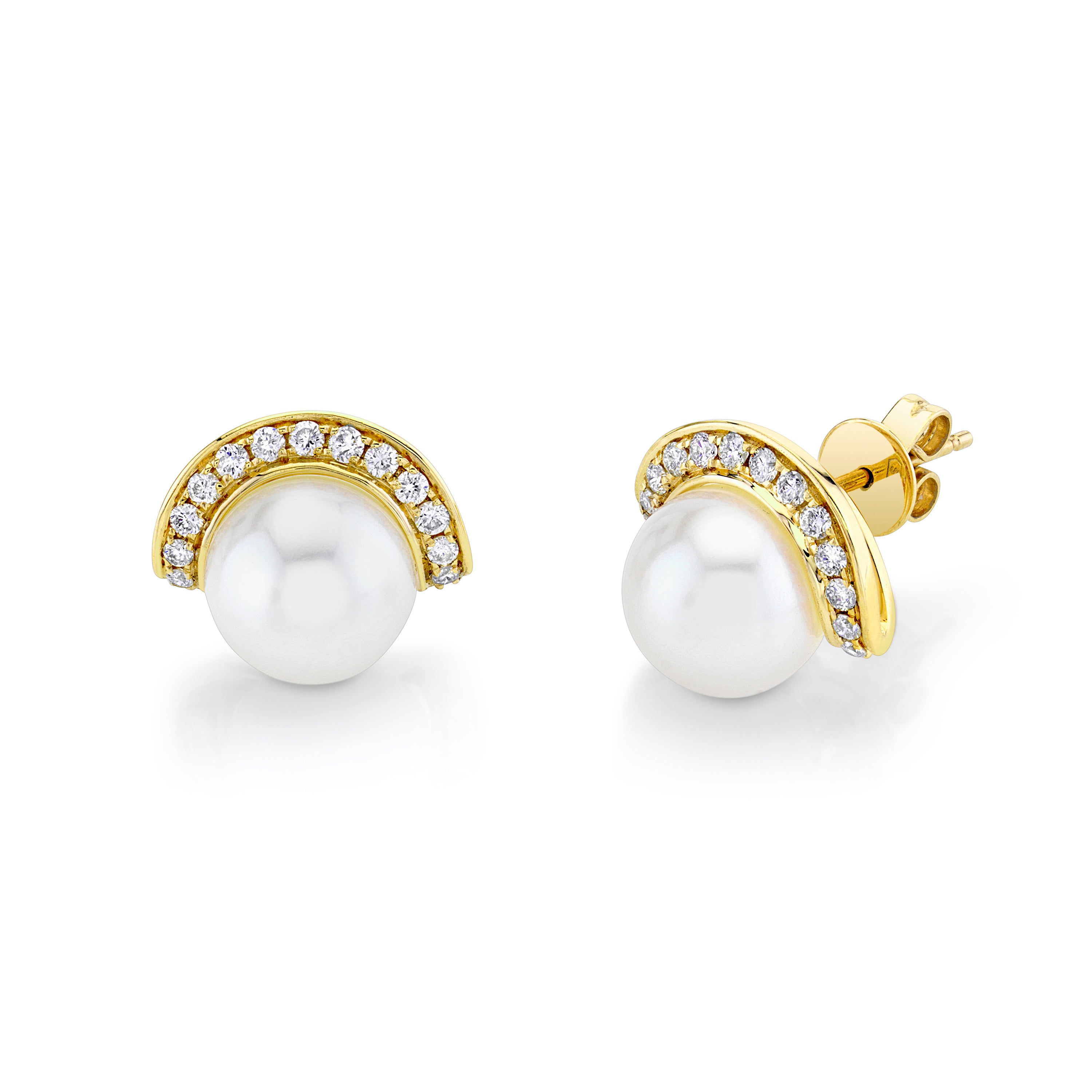 The SHAY Pearl & Diamond Half Moon Studs include a 9mm all natural white pearl stud with an 18k gold and pave diamond half moon setting with a beautiful polished finish, using post back fastening.