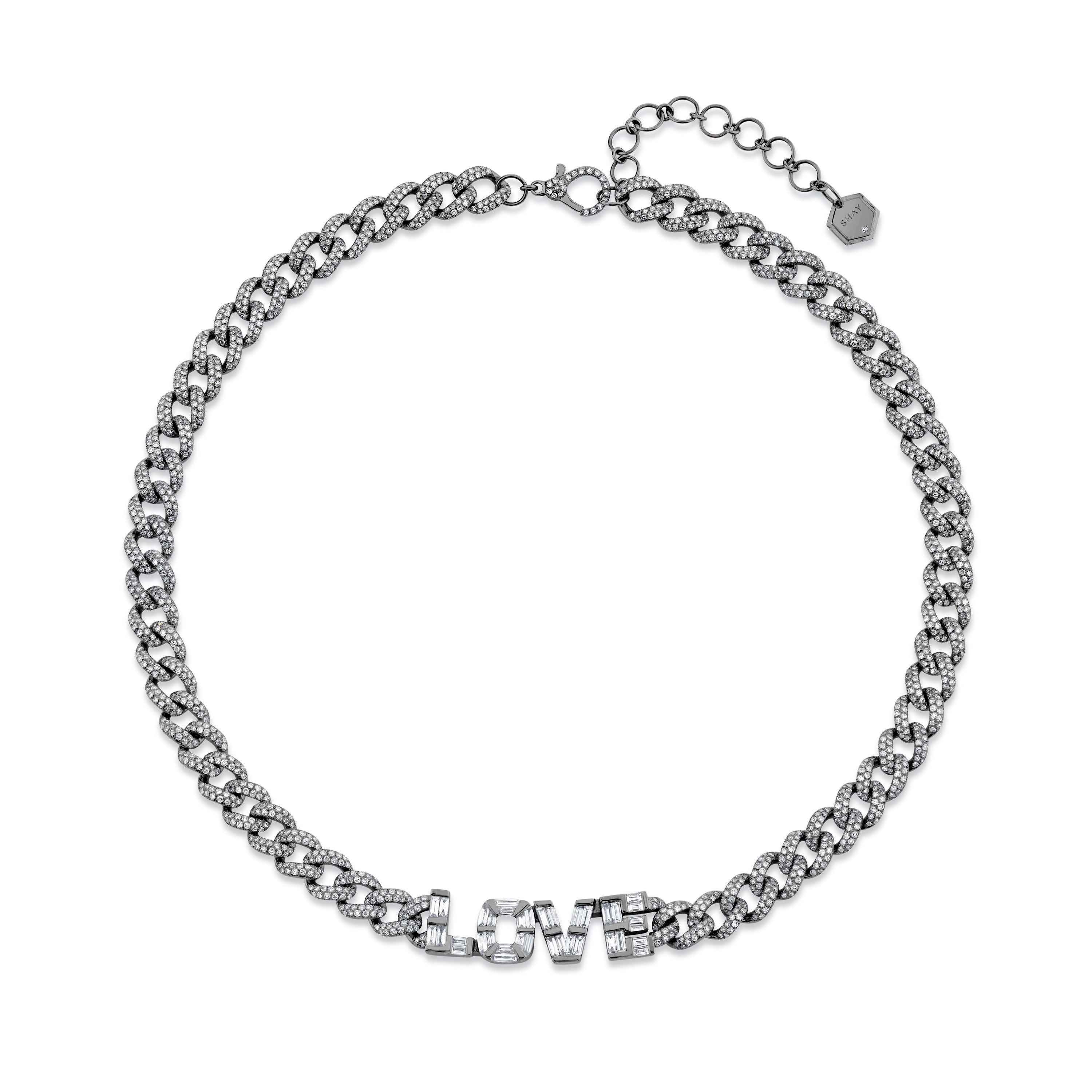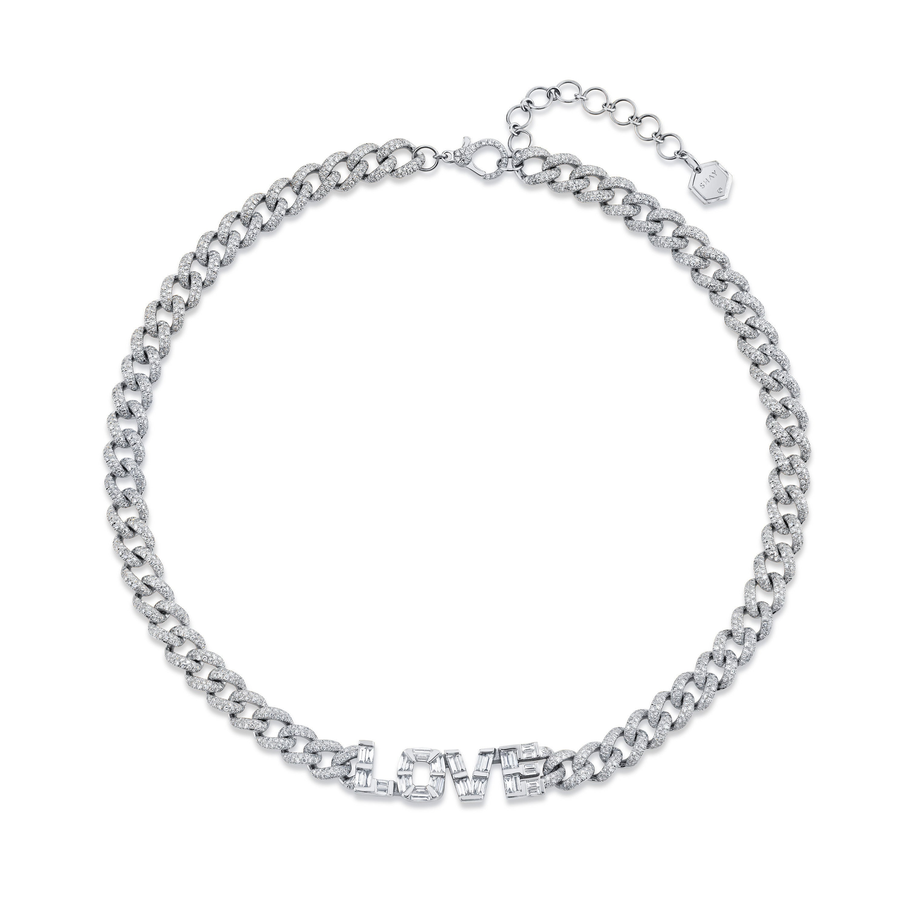 The SHAY Diamond Baguette Personalized 4 Letter Medium Link Necklace features 4 personalized diamond baguette letters set on our signature hand-crafted white diamond pave 8mm Cuban link chain. Defined by bold lettering, this modern keepsake makes a statement or perfectly pairs for layering.