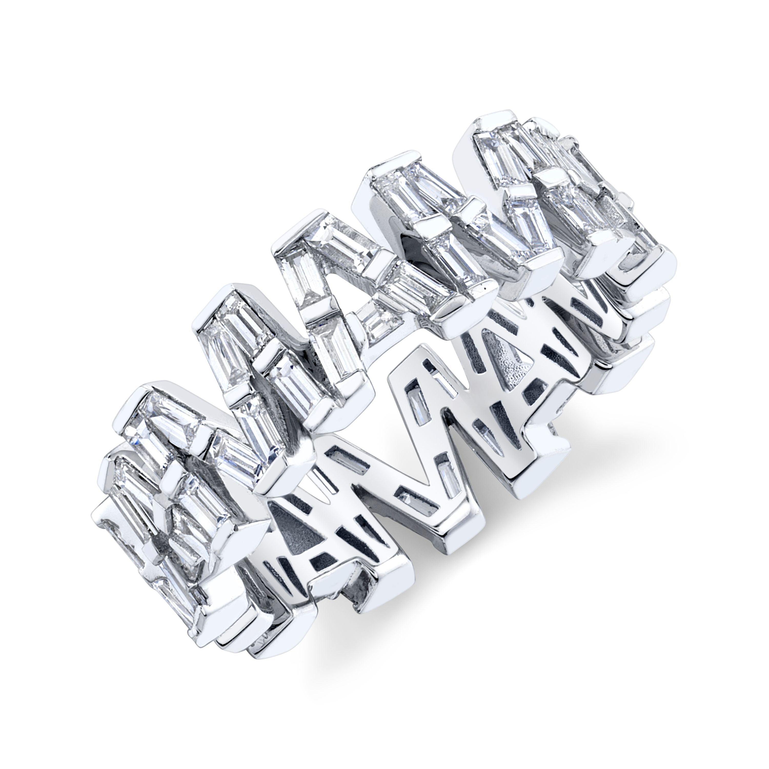 The SHAY Diamond Baguette Personalized 4 Letter Eternity Band features a baguette diamond MAMA personalization. Crafted in 18k gold, the band is 7mm wide.
