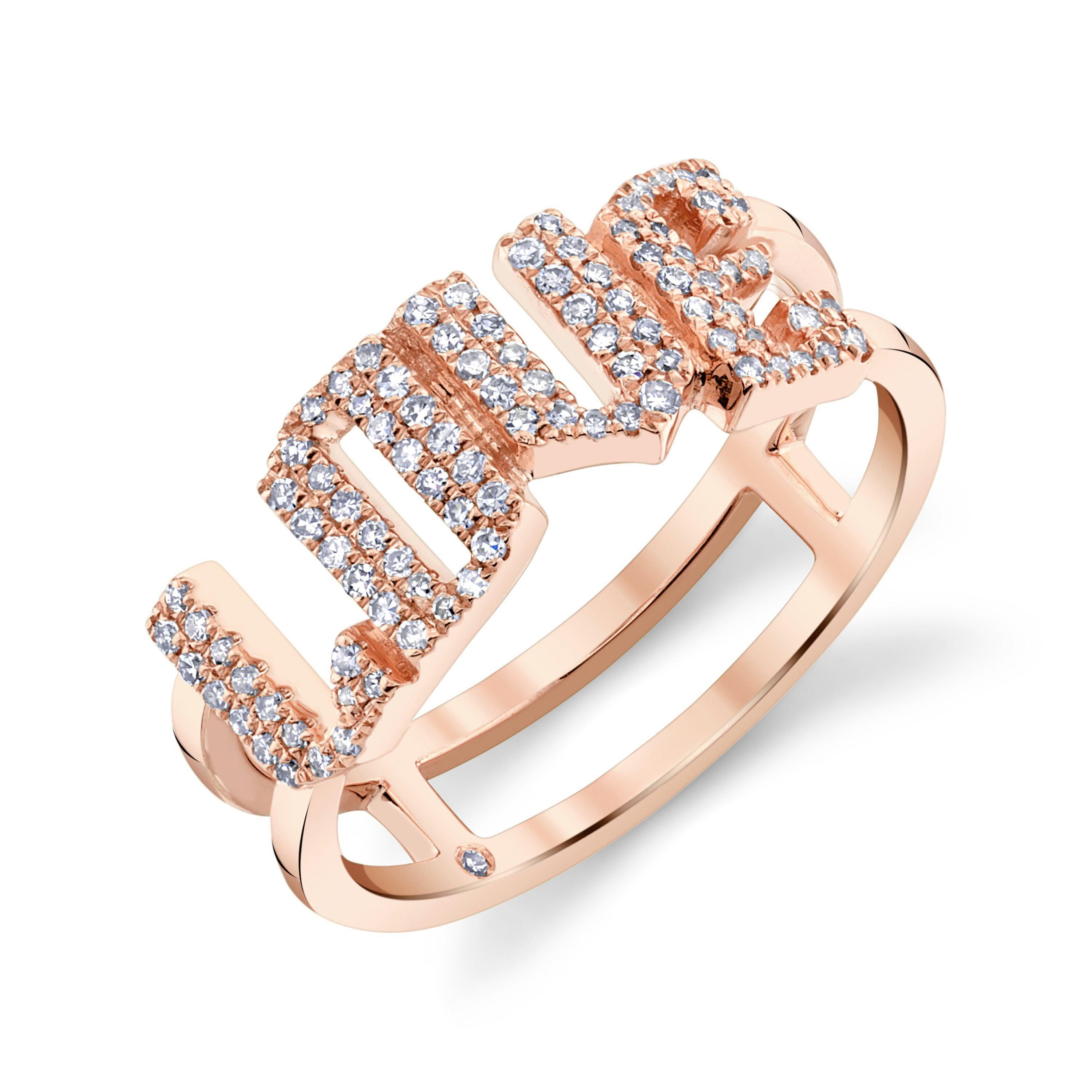 The SHAY Diamond Pave Personalized Stacked 4 Letter Ring. This 18k gold personalized 4 letter ring can be customized for any name. The band has white diamond pave on the gothic font letters.