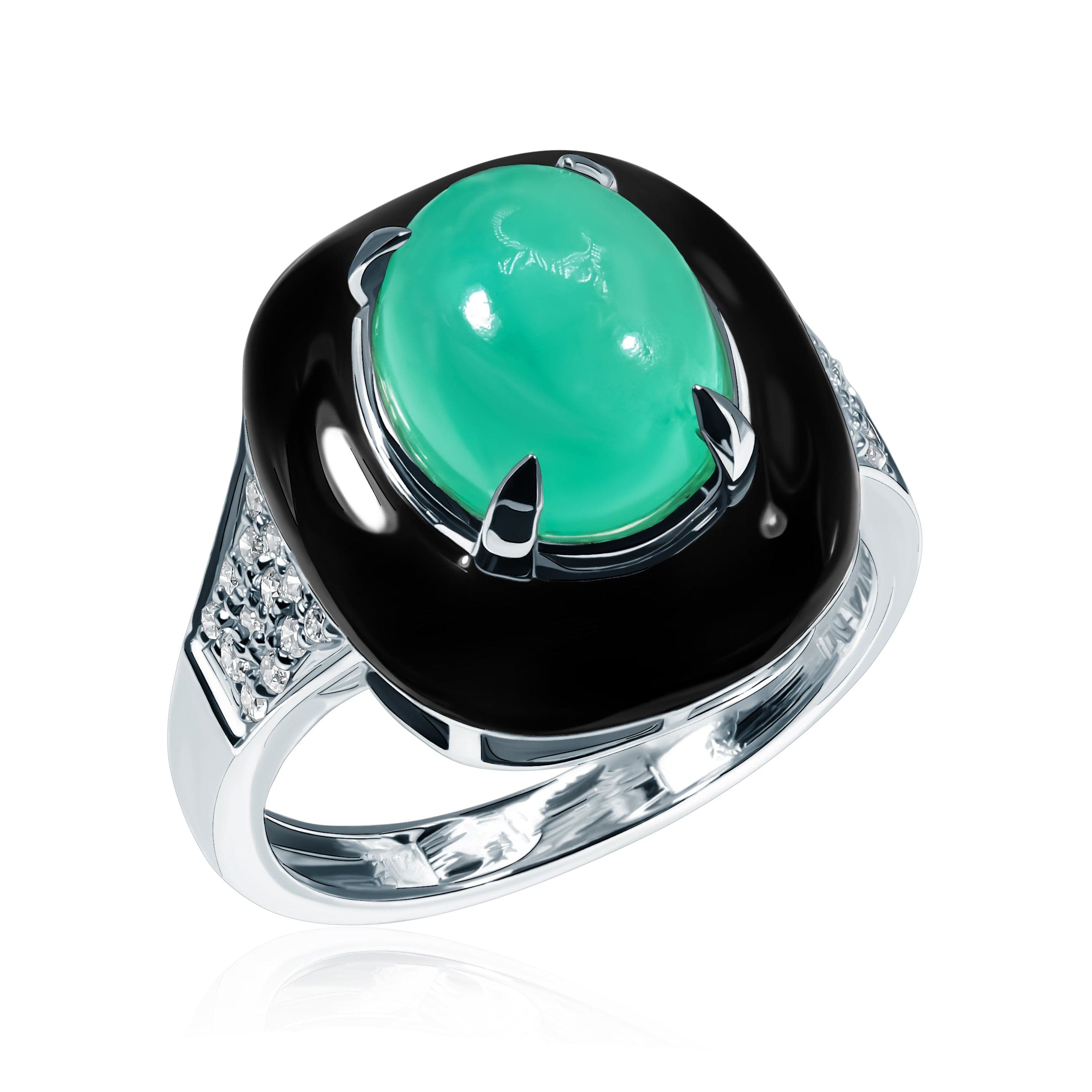 We present to your attention a unique piece of jewelry - an incredible design, a specially cut gemstone, and jewelry enamel that emphasizes the gem's depth. Fama ring with a cabochon-cut emerald - smooth, without edges, complemented by diamonds and black jewelry enamel.