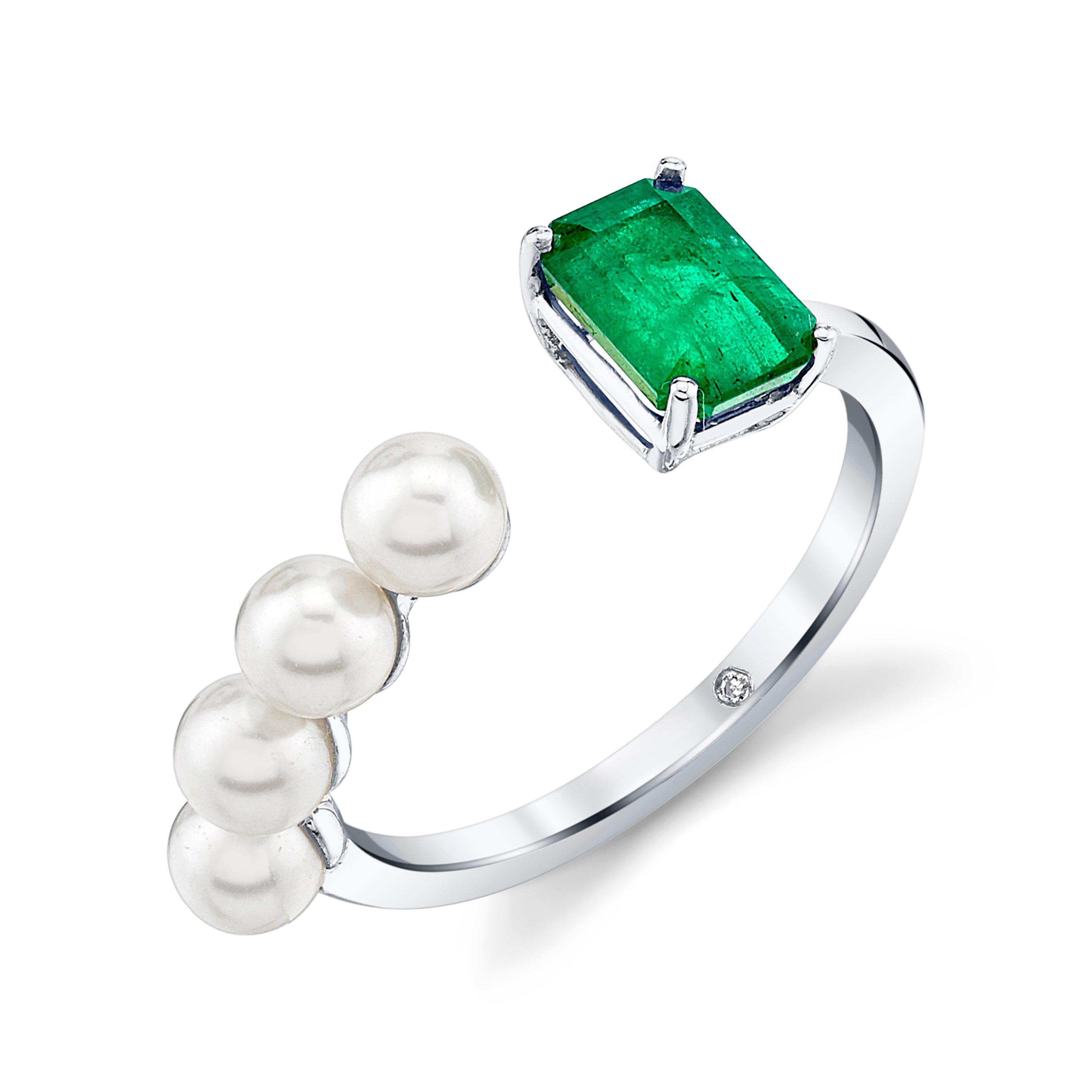 The SHAY Pearl & Emerald Stacked Floating Ring features our signature floating ring style with a gorgeous emerald cut emerald in a four prong setting and four beautiful all natural pearls line down the side of the band. This ring is the perfect contrast of feminine and fun.