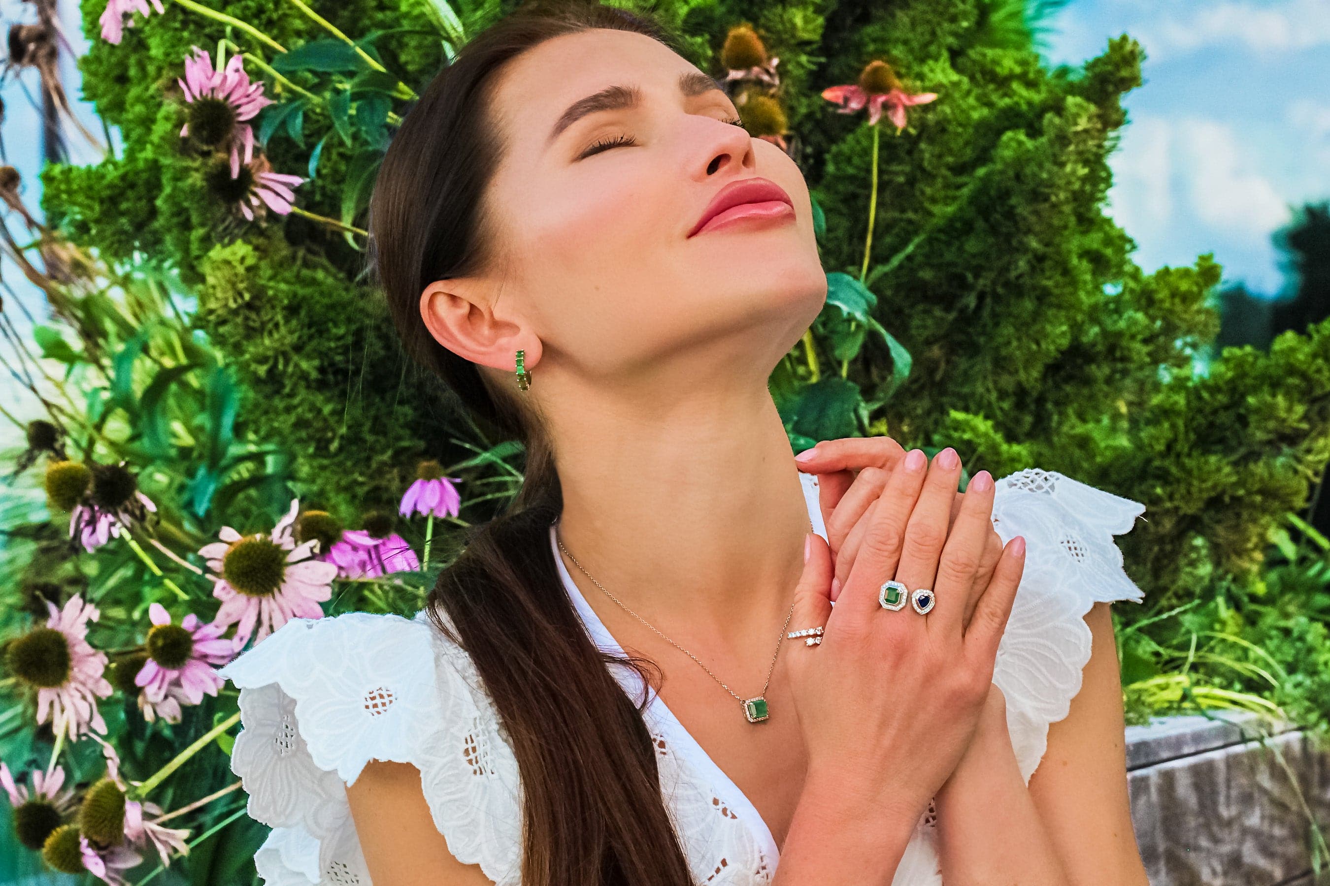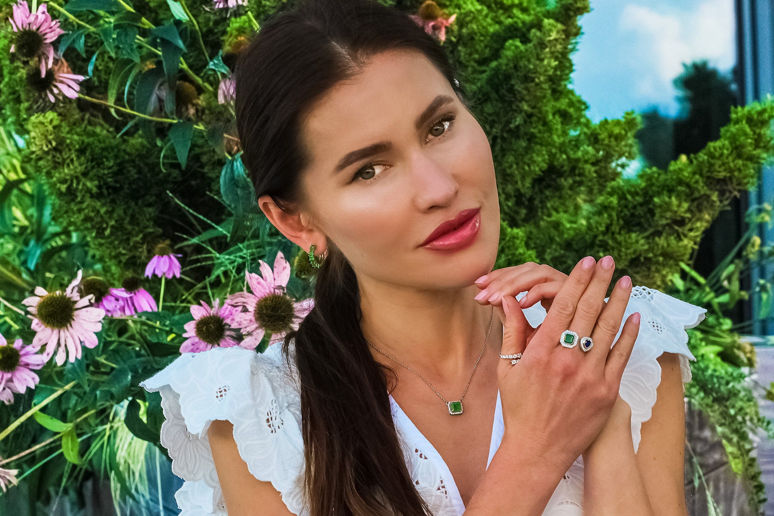 Cozy house in the woods with a river nearby. Crystal water, clean air, and genuine beauty of nature. Close your eyes, and immerse yourself in harmony with nature with the Forest River emerald, sapphire, and diamond ring.