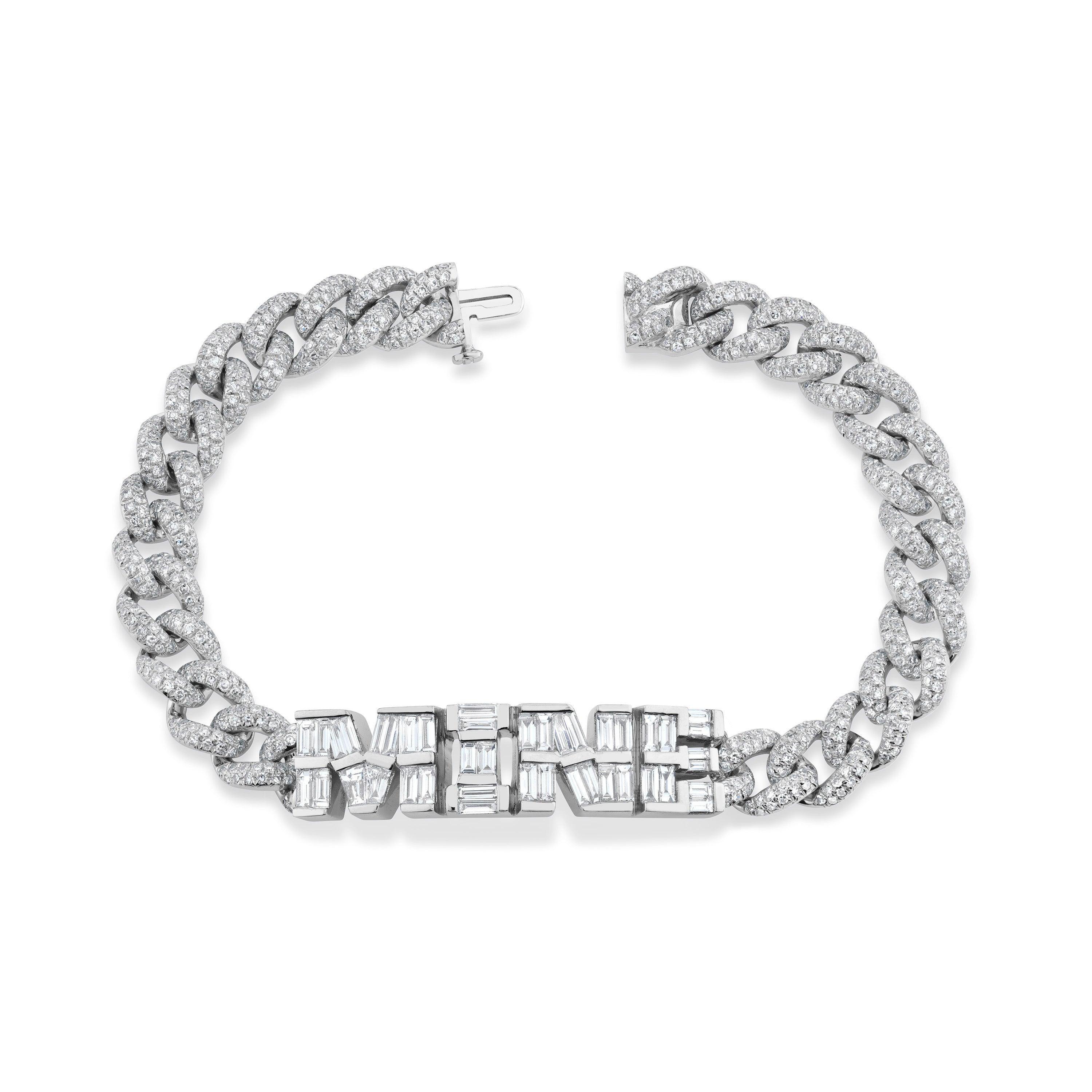 The SHAY Diamond 4 Baguette Custom Name Pave Link Bracelet features a baguette diamond 4 letter personalization. Crafted in 18k gold, the band features handcrafted white diamond pave on an 8mm Cuban link chain.