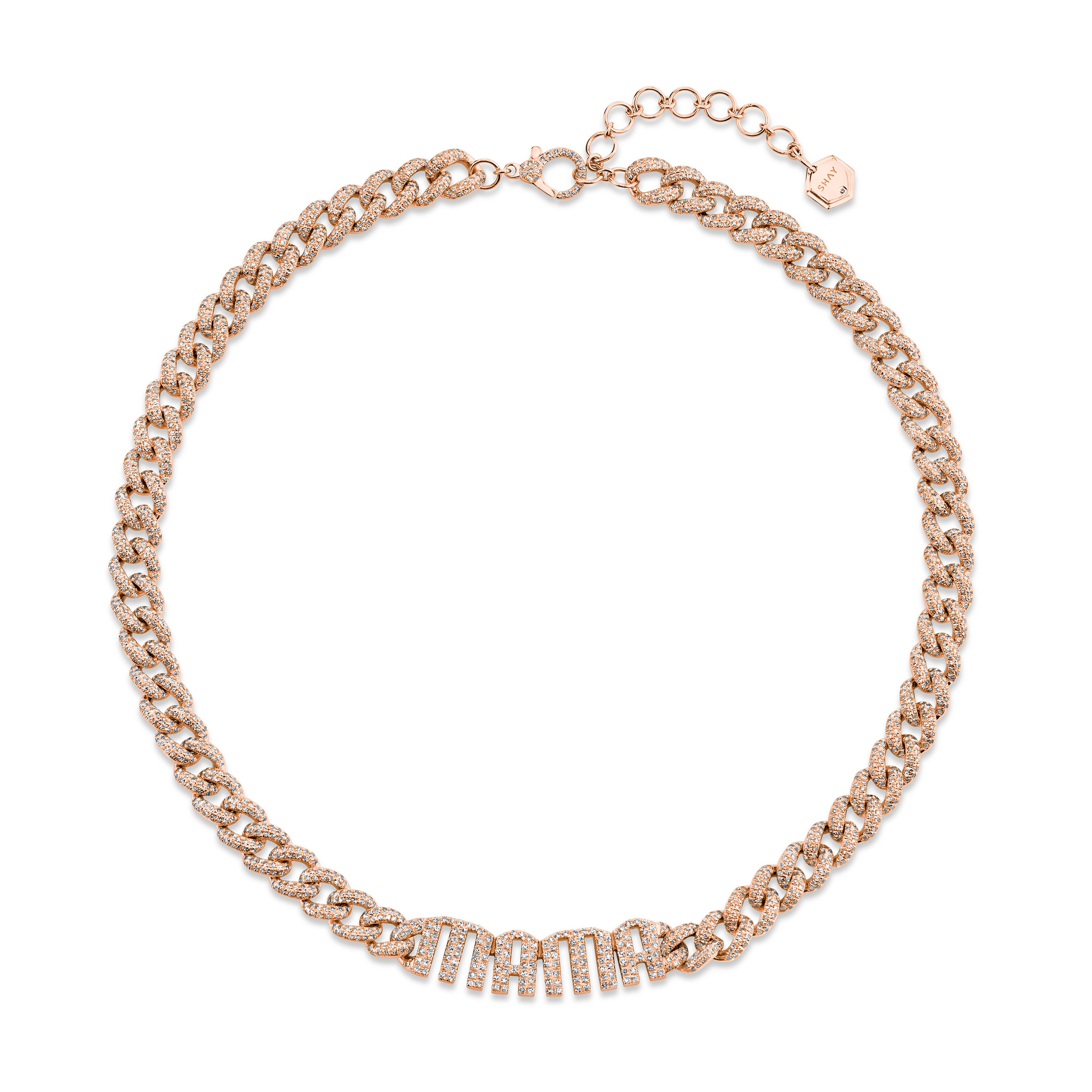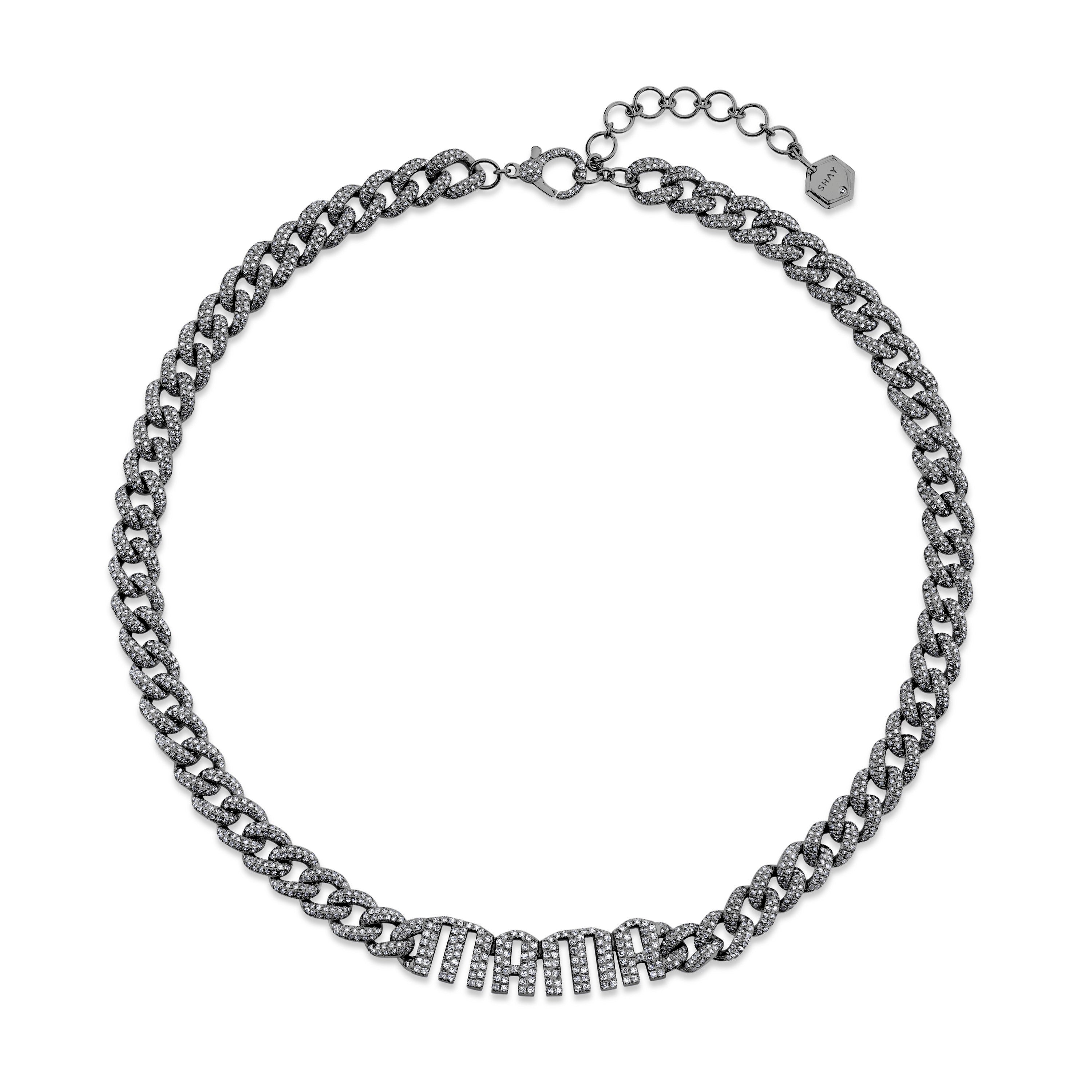 The SHAY Diamond Pave Personalized 4 Letter Medium Link Necklace features our 18k gold medium cuban chain link with white diamond pave and a 4 letter customization in the center that is covered in 7.70cts of white diamond pave.