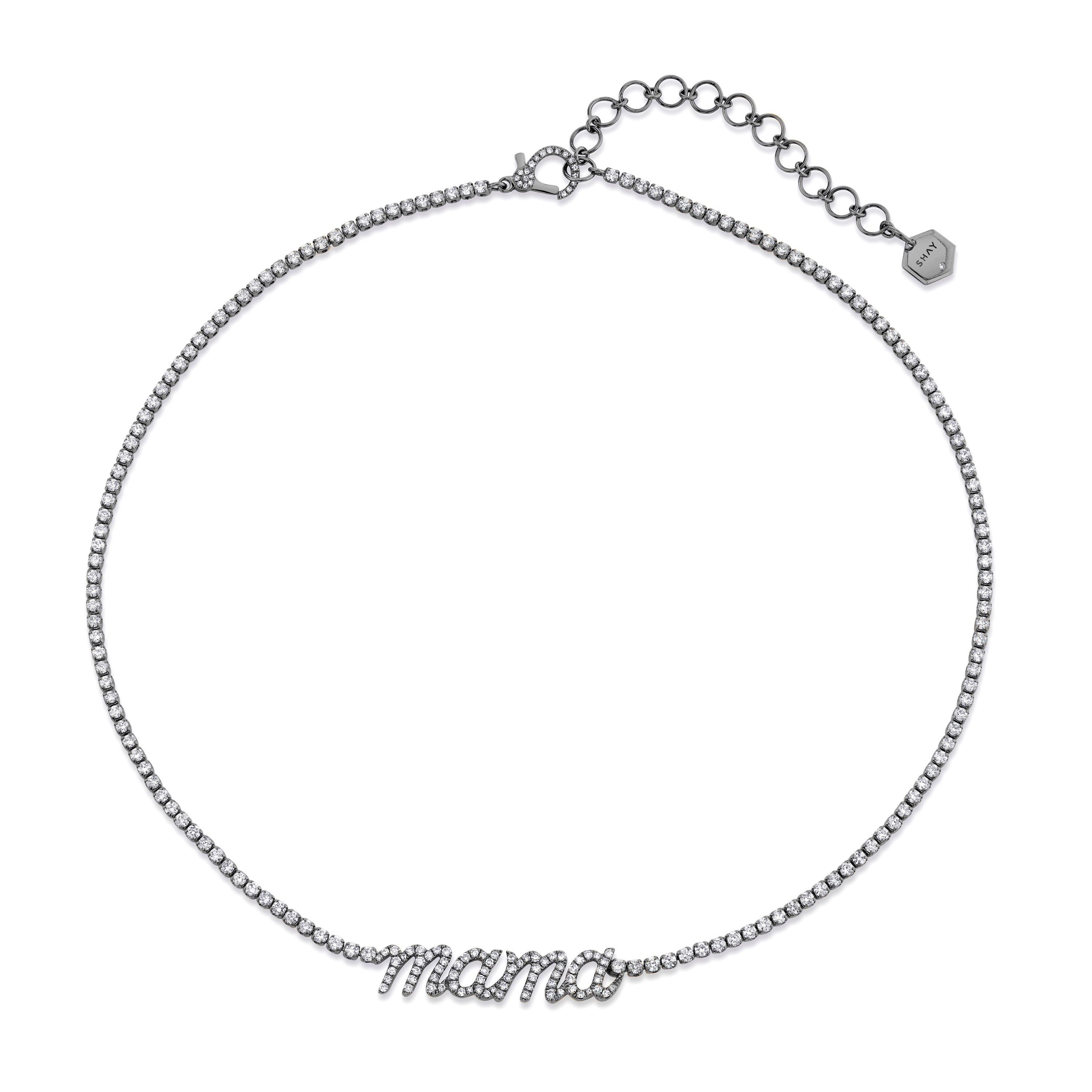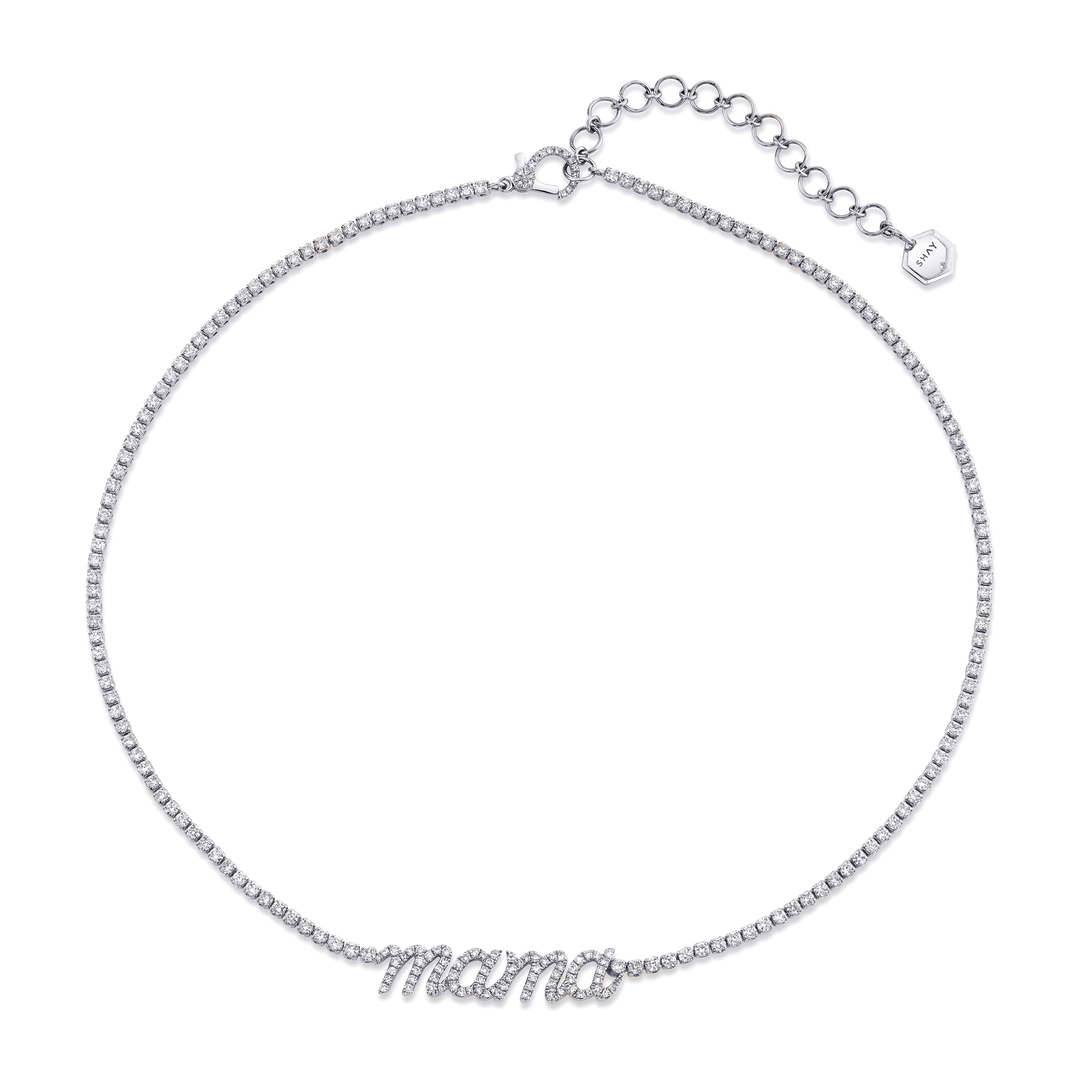 The SHAY Diamond Threads Personalized Cursive 4 Letter Necklace features our pave diamond threads tennis necklace that is 1.9mm wide. Add your custom cursive 4 letters that are 7mm in total length.