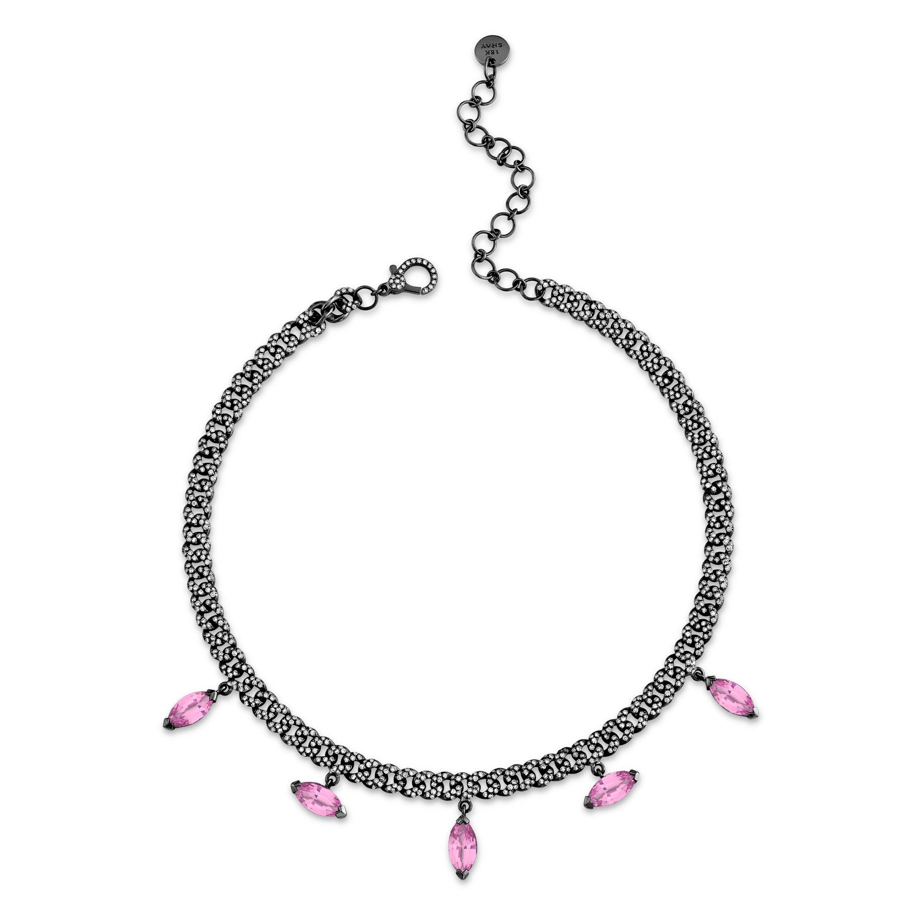 The SHAY Pink Sapphire Marquise Drop Mini Link Necklace features 5 exquisite pink sapphire drops hanging from a diamond pave mini choker. Its adjustable length means it can be worn as a choker or necklace and is perfect for stacking or as a statement piece on its own.
