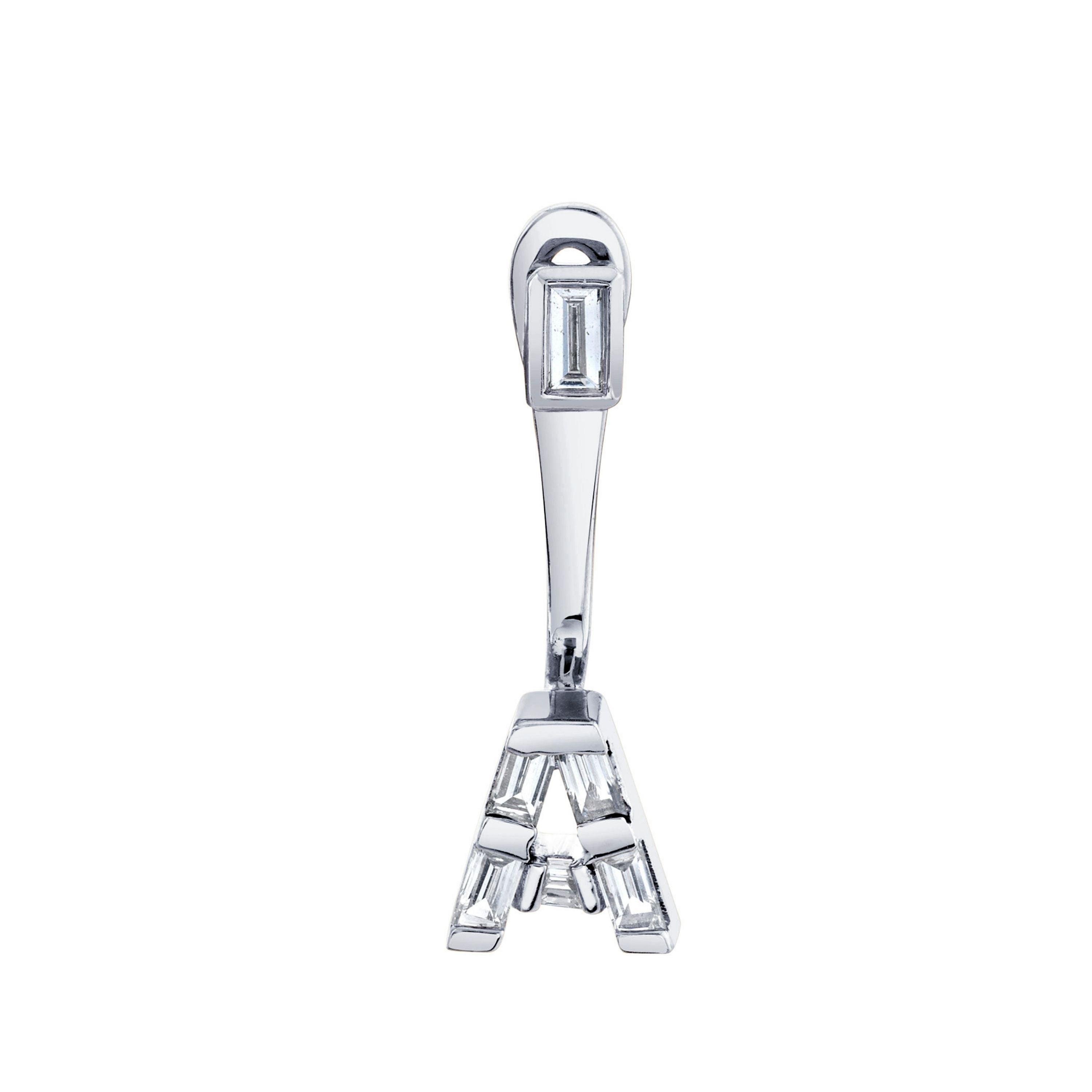 The SHAY Diamond Baguette Single Initial Cap Ear Jacket features both a removable diamond baguette stud and your diamond baguette custom initial ear jacket with a post back closure.