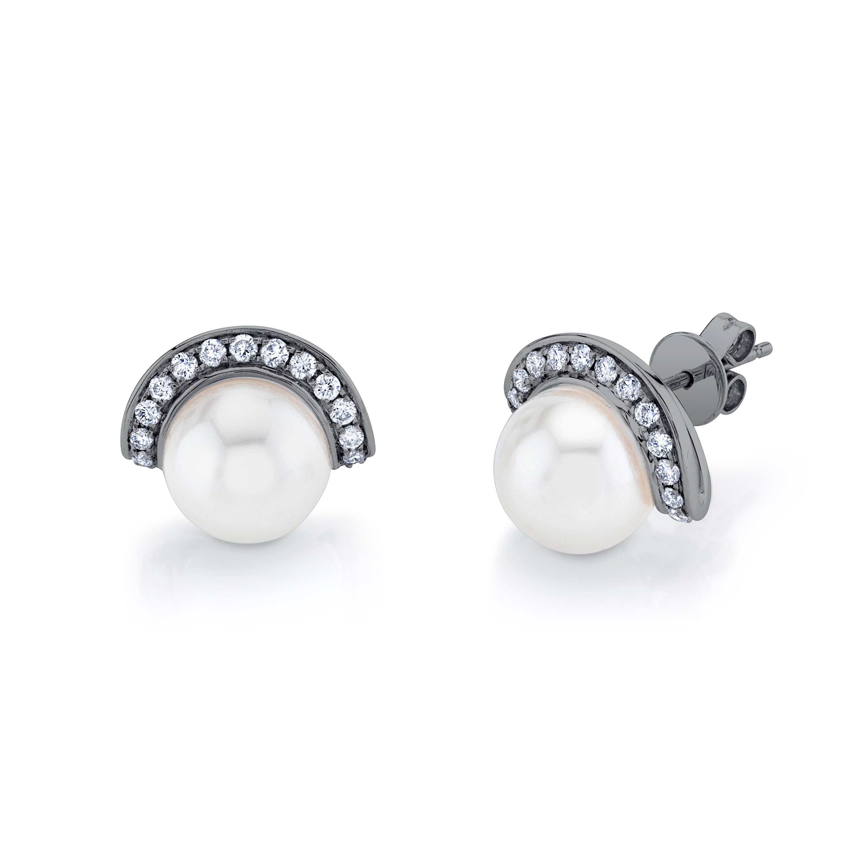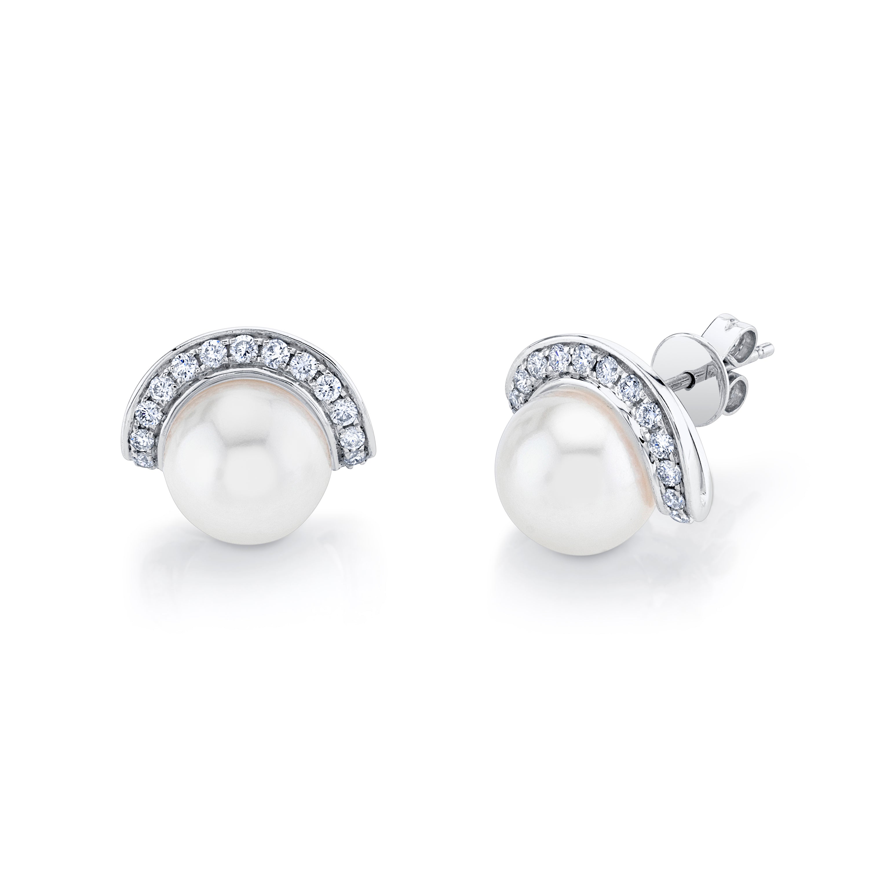 The SHAY Pearl & Diamond Half Moon Studs include a 9mm all natural white pearl stud with an 18k gold and pave diamond half moon setting with a beautiful polished finish, using post back fastening.