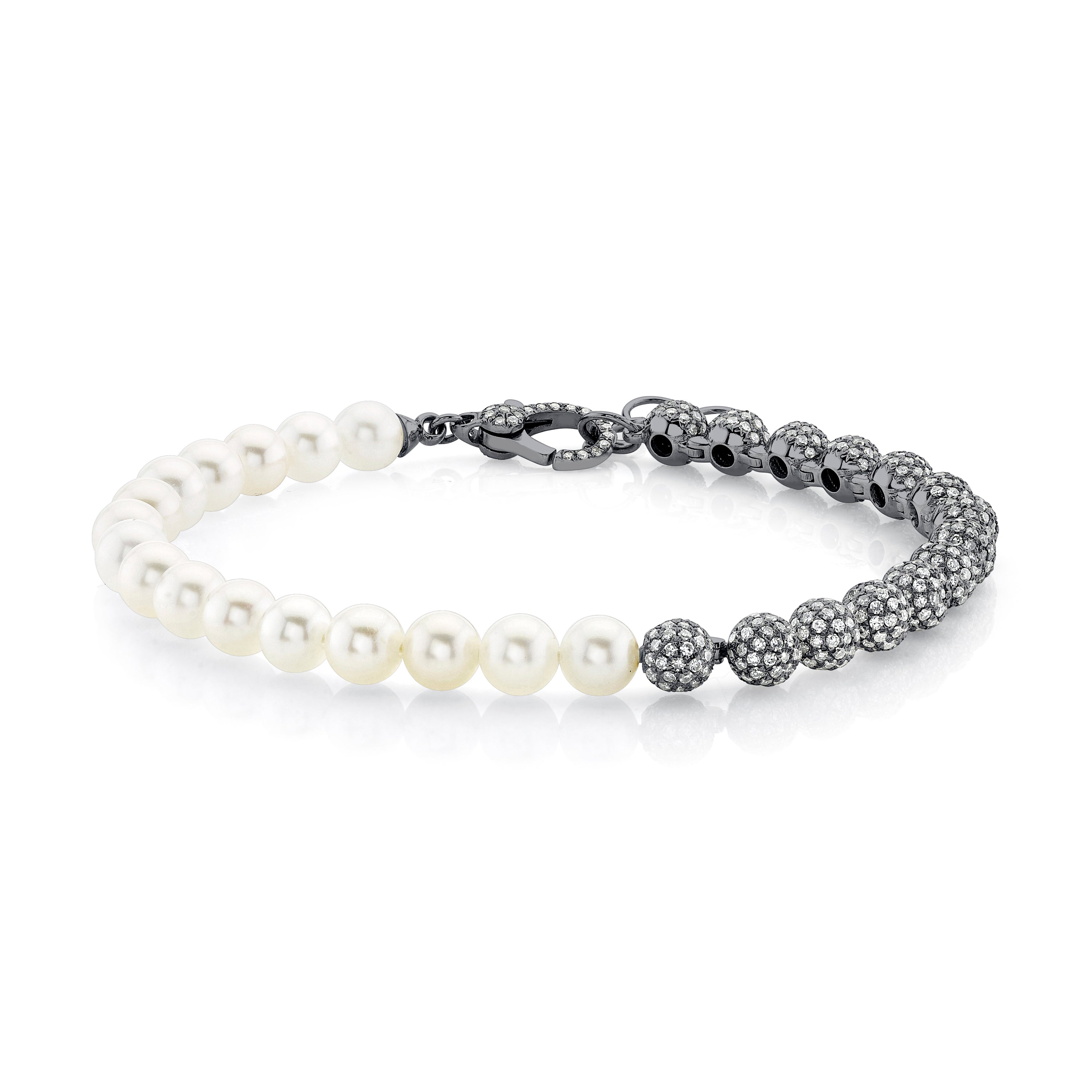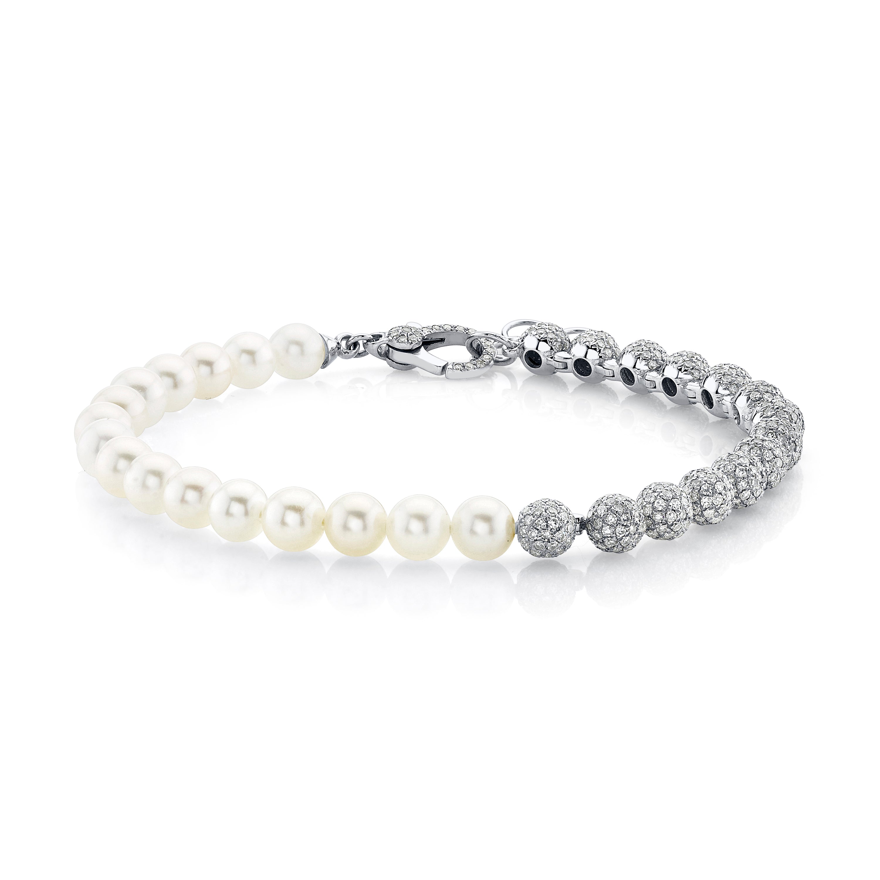 The SHAY Pearl & Diamond Split Bracelet features pave beaded balls on one side, and all natural pearls, secured by a pave lobster clasp, creating the perfect fine jewelry combination.