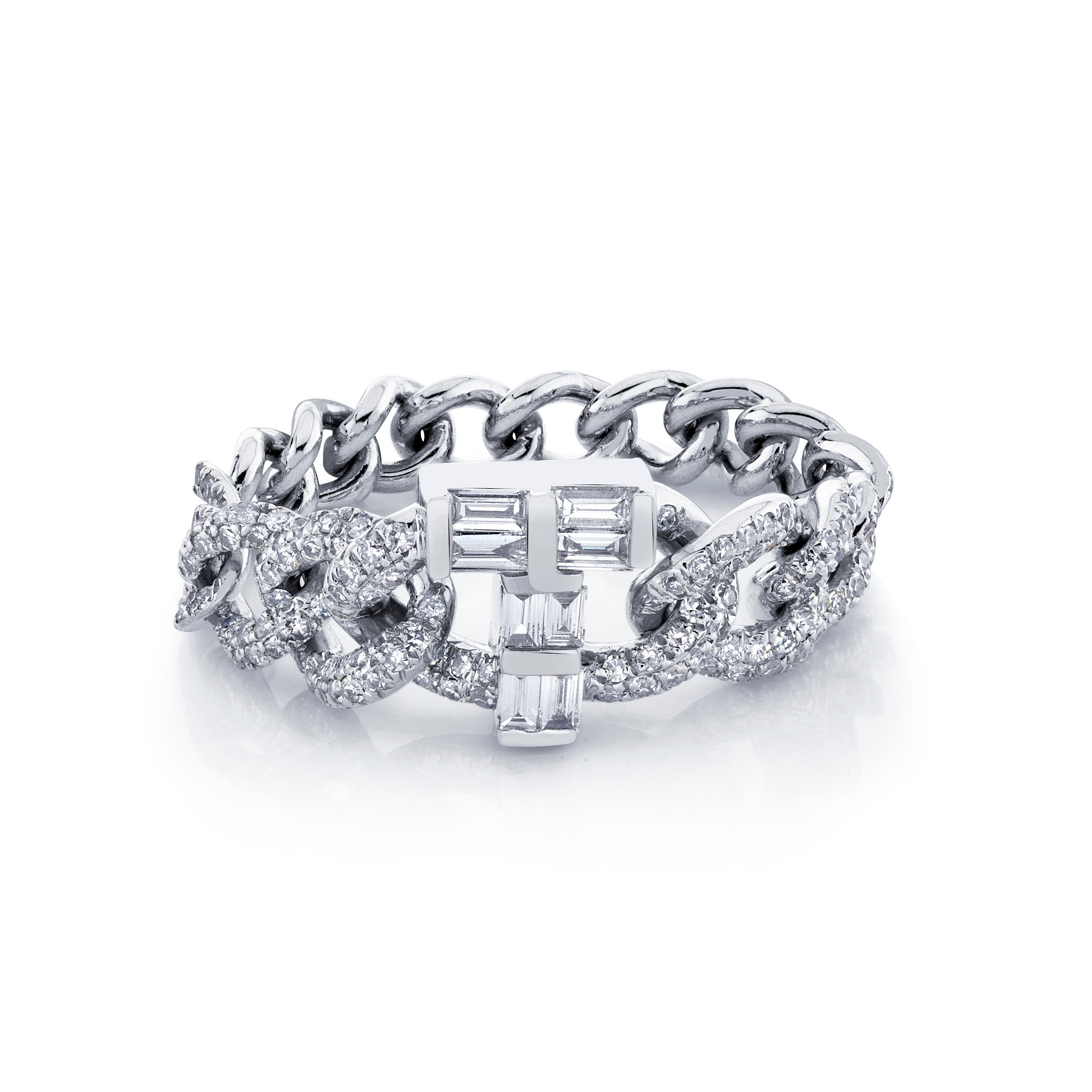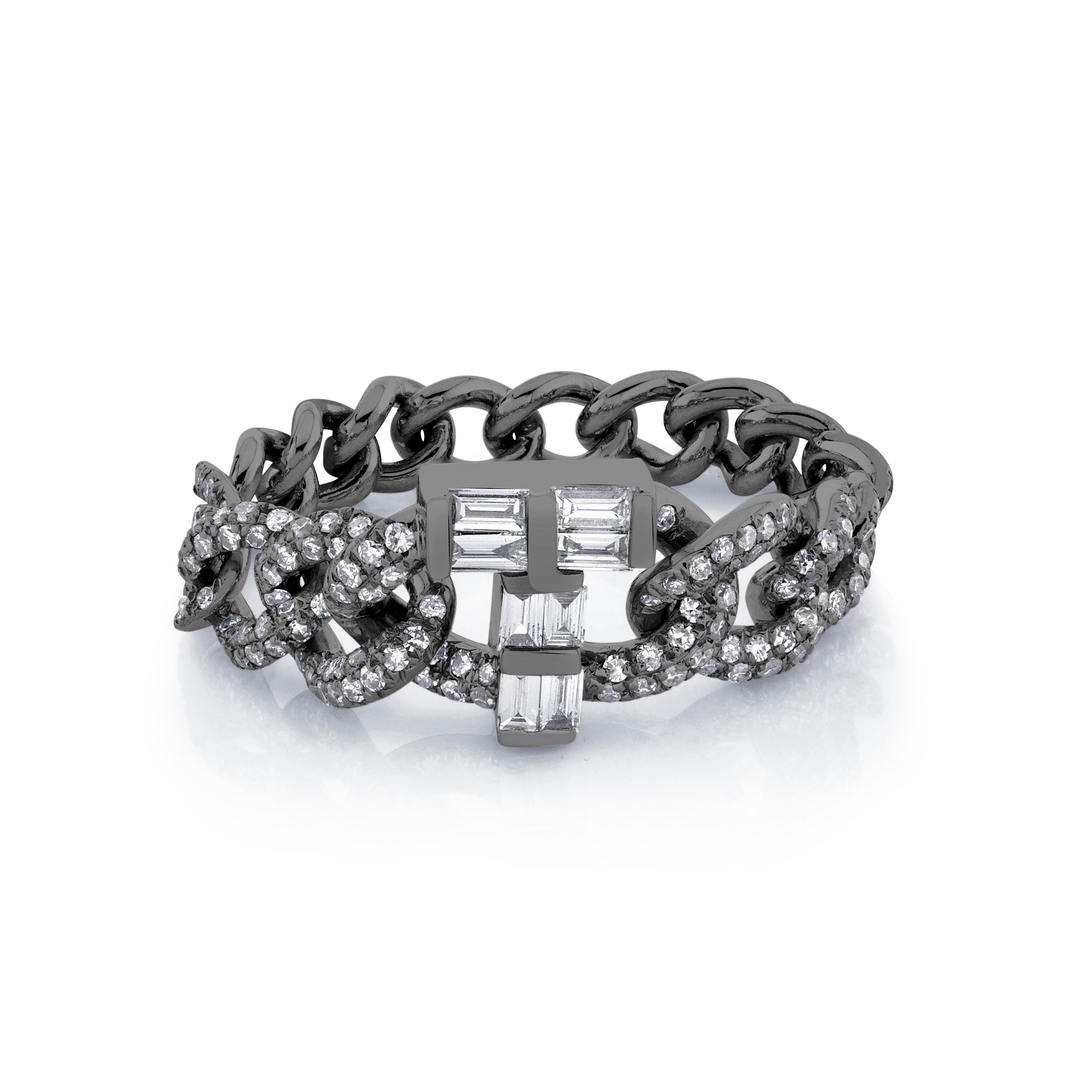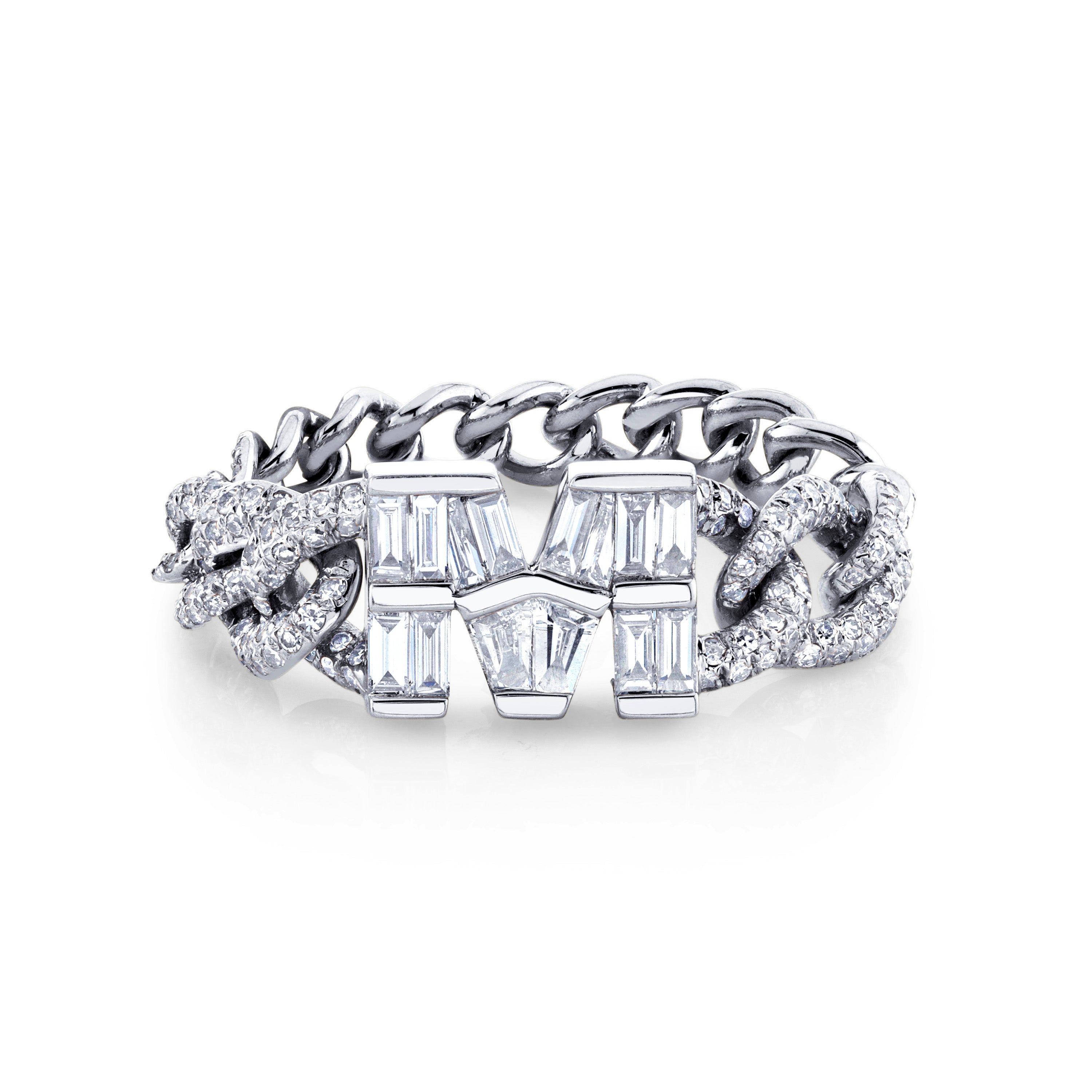 The SHAY Diamond Baguette Personalized Initial Gradual Link Ring features our signature pave links with a centered accent of a white diamond baguette initial that is 8mm wide.
