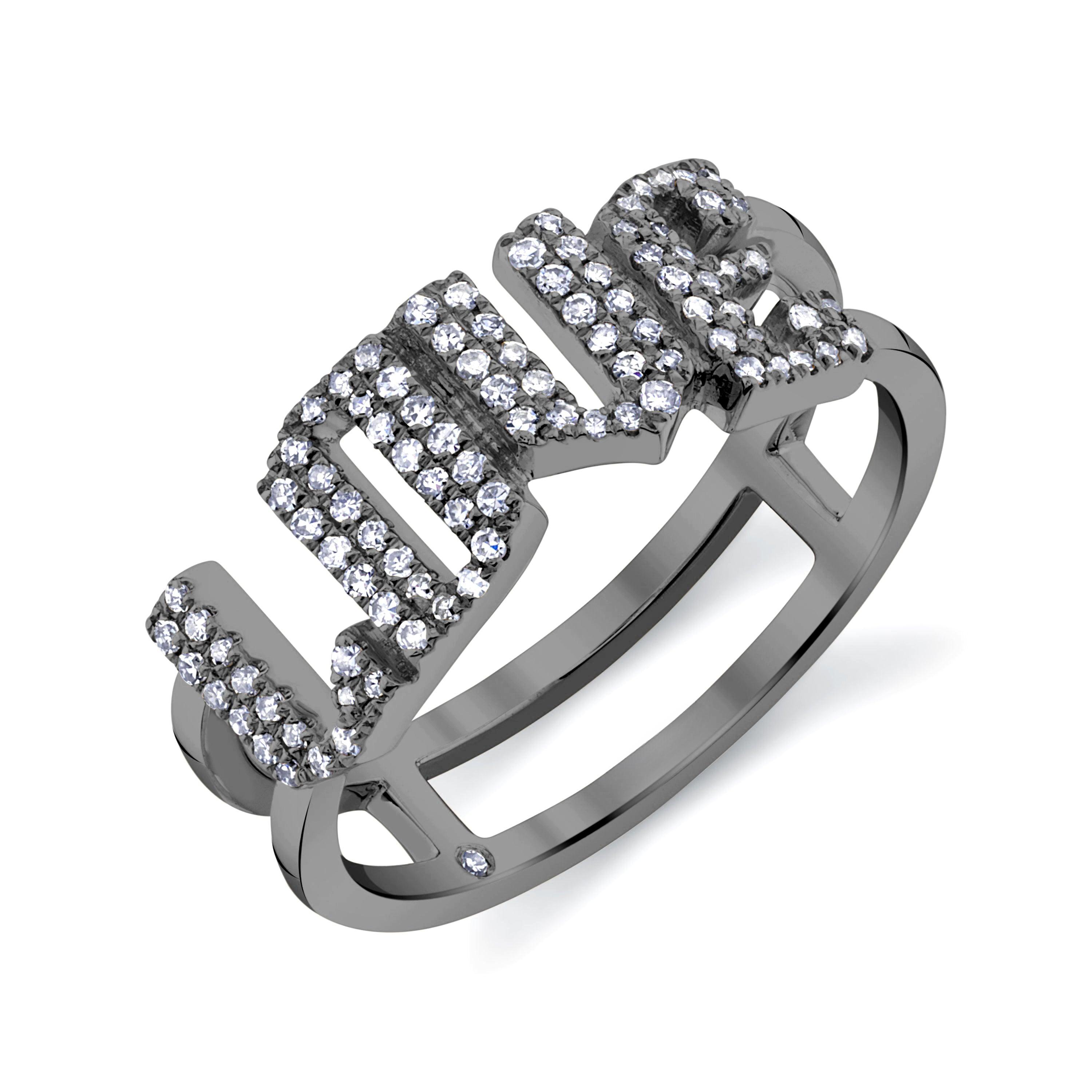 The SHAY Diamond Pave Personalized Stacked 4 Letter Ring. This 18k gold personalized 4 letter ring can be customized for any name. The band has white diamond pave on the gothic font letters.
