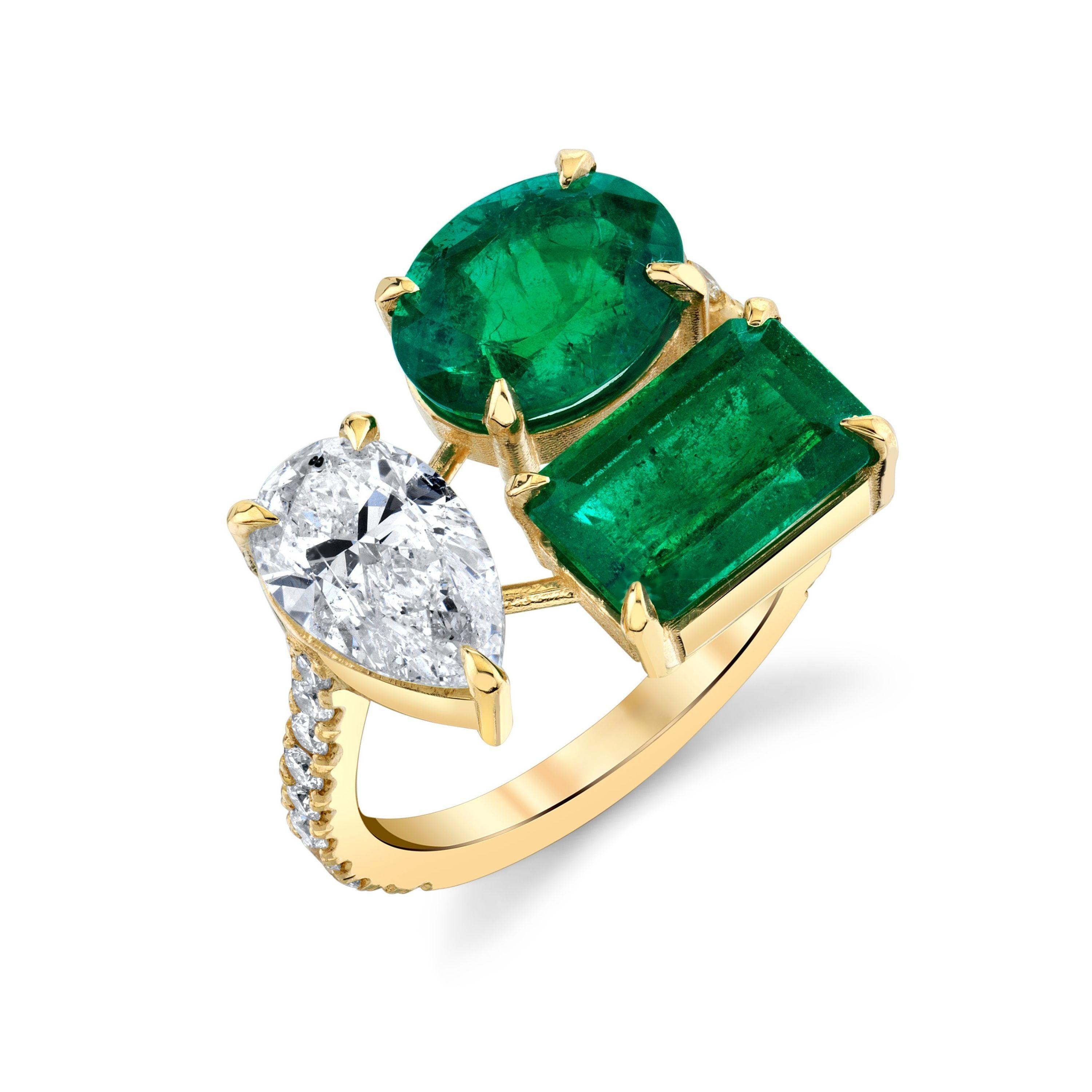 The SHAY Diamond & Emerald Pear Triple Threat Ring features one-of-a-kind gemstones in an open setting.