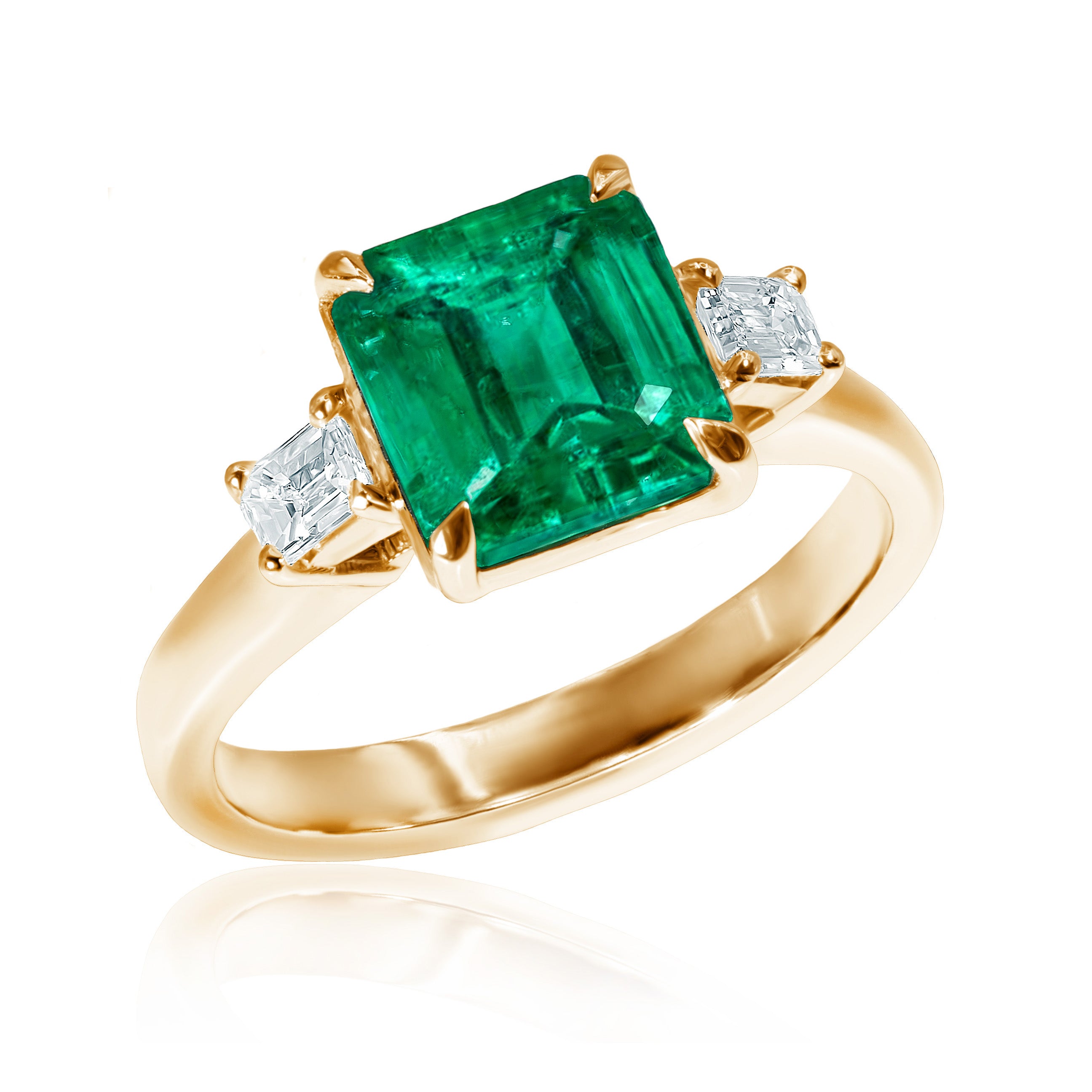 Emerald is a stone. Once you see it, you fall in love with its depth forever. This gem flaunts in the Silenus ring, and two diamonds emphasize its excellence.