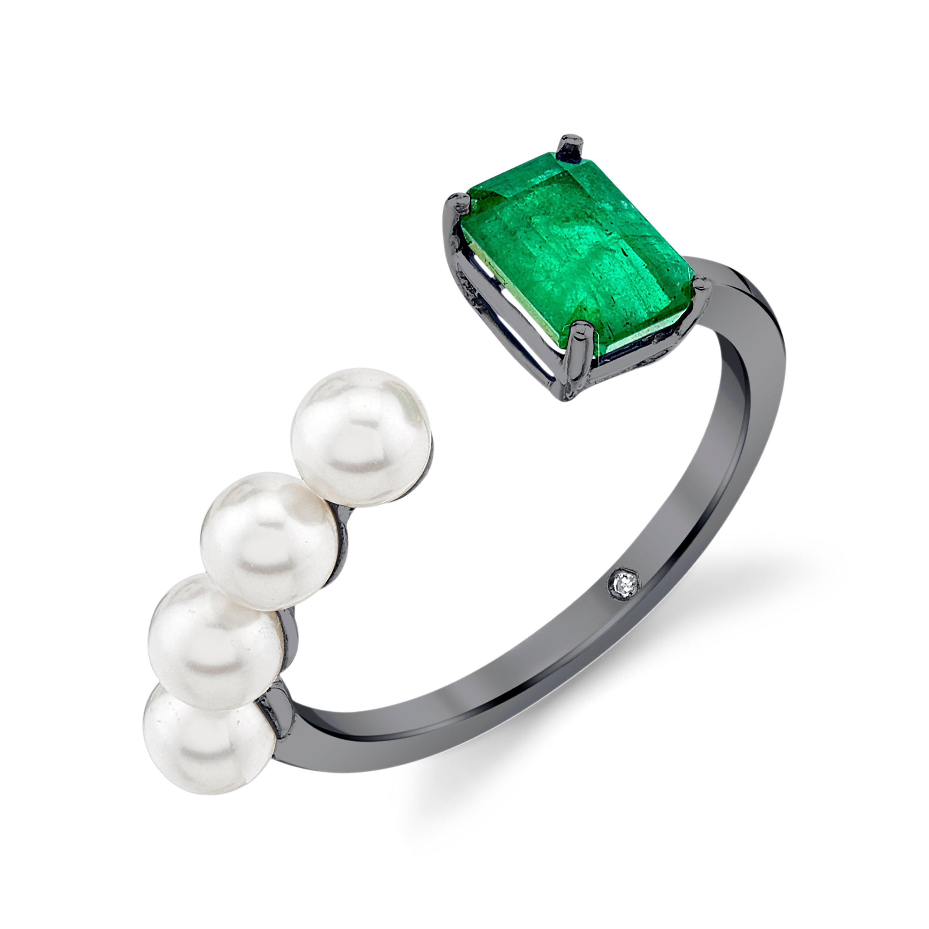 The SHAY Pearl & Emerald Stacked Floating Ring features our signature floating ring style with a gorgeous emerald cut emerald in a four prong setting and four beautiful all natural pearls line down the side of the band. This ring is the perfect contrast of feminine and fun.