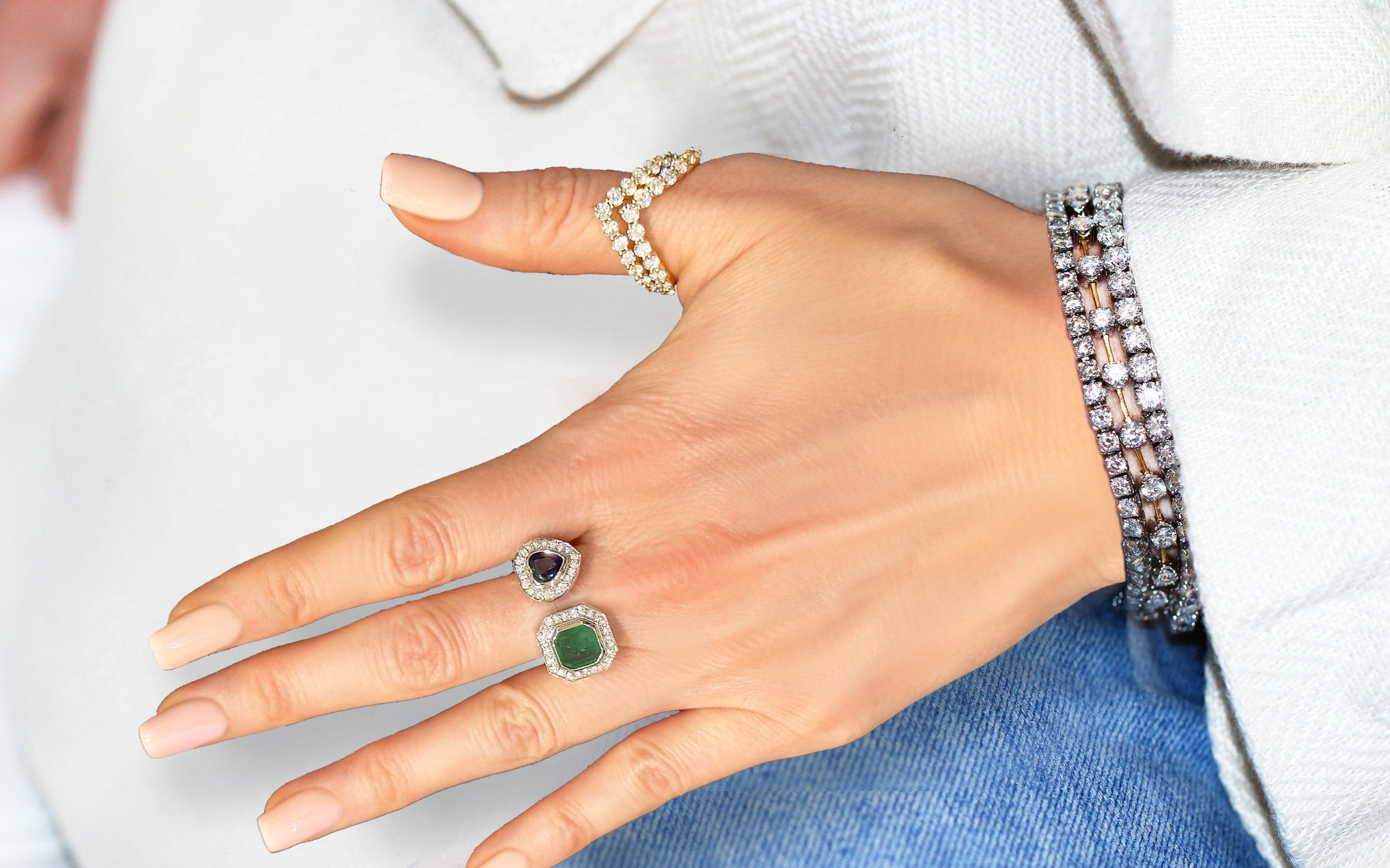 Cozy house in the woods with a river nearby. Crystal water, clean air, and genuine beauty of nature. Close your eyes, and immerse yourself in harmony with nature with the Forest River emerald, sapphire, and diamond ring.