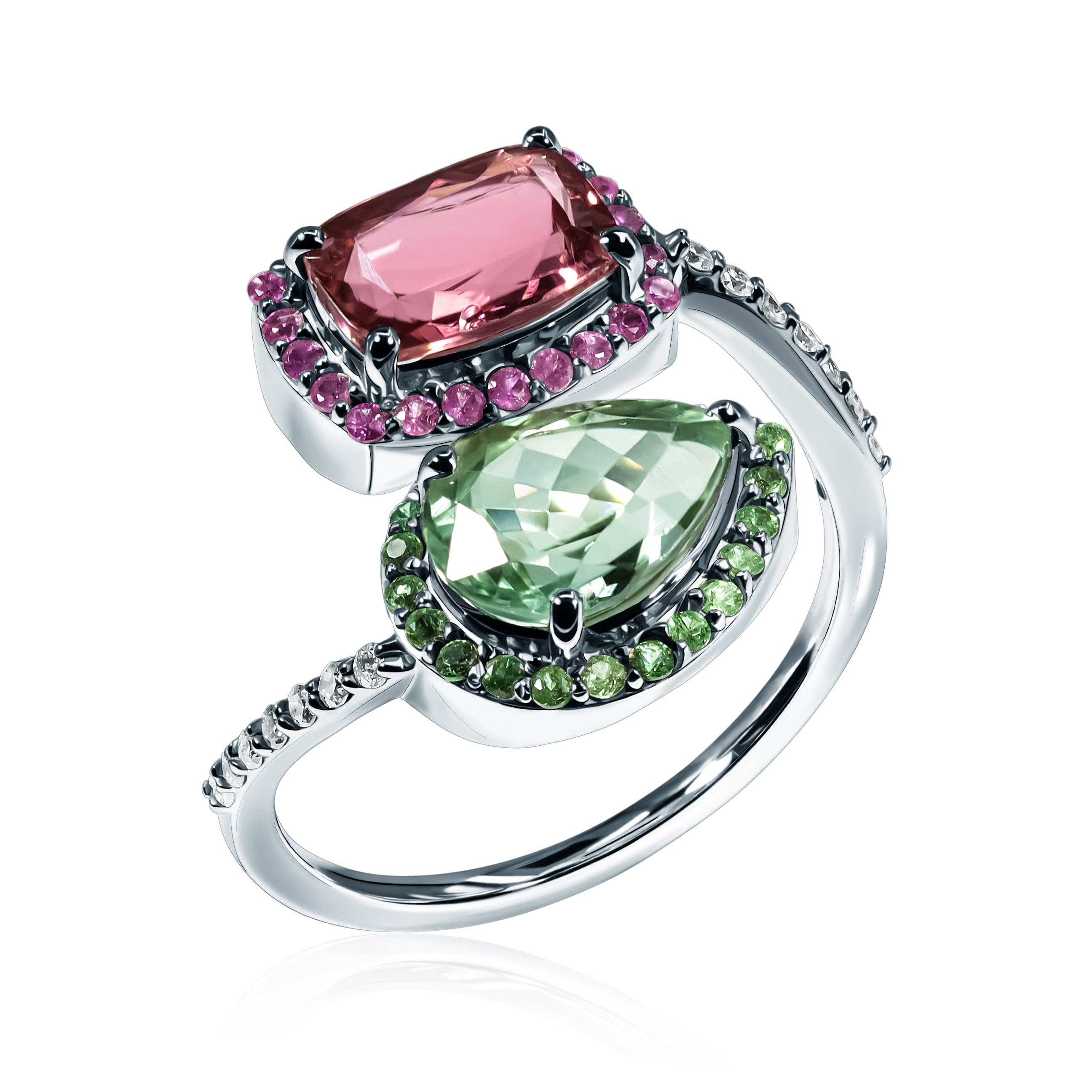 White Gold ring with Tourmaline, Sapphires and White Diamonds. This item in stock ready to ship in 1- 3 days.